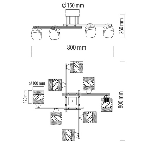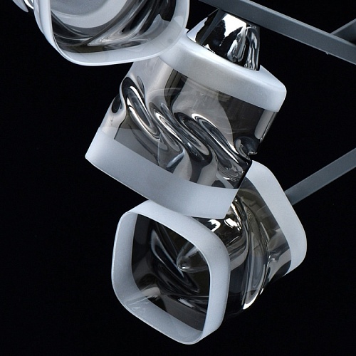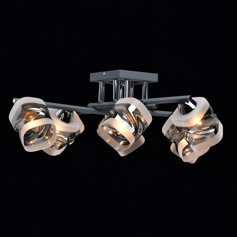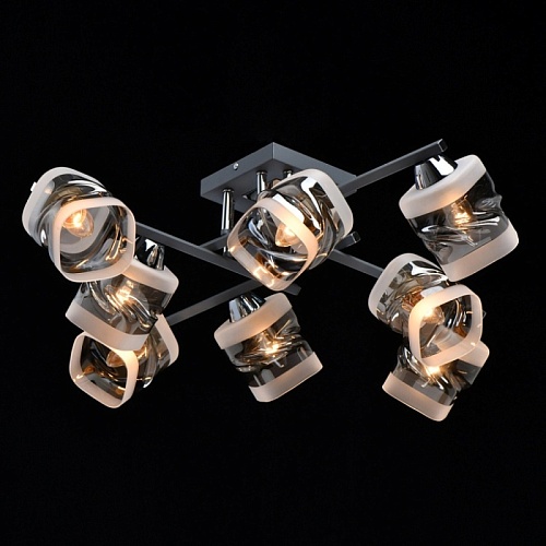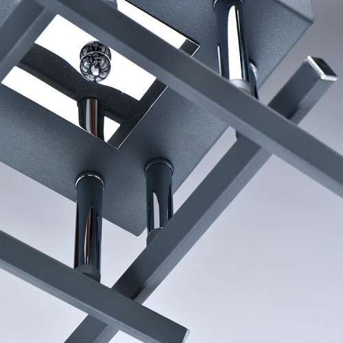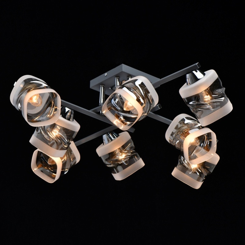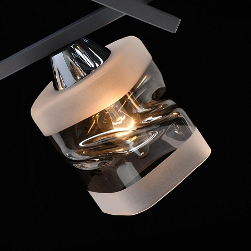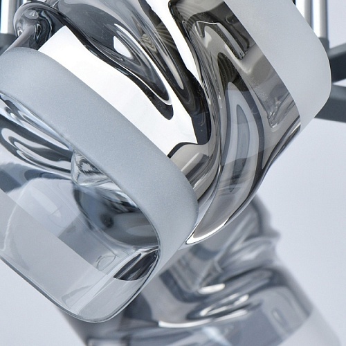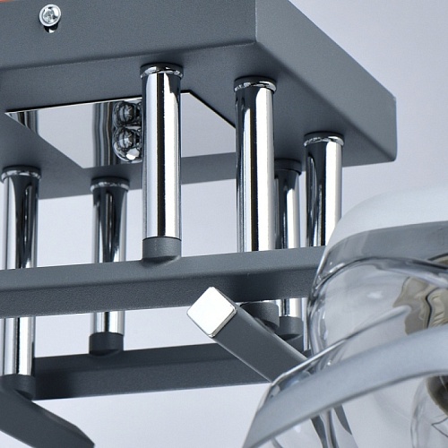 Основание светильника выполнено из металла и окрашено в серый цвет. Отдельные элементы основания гальванизированы в цвет хрома. Светильник декорирован оригинальными стеклянными плафонами. Плафоны отлиты в сложную форму. По краям стекло матировано, в средней части - гальванизировано в дымчатый цвет.