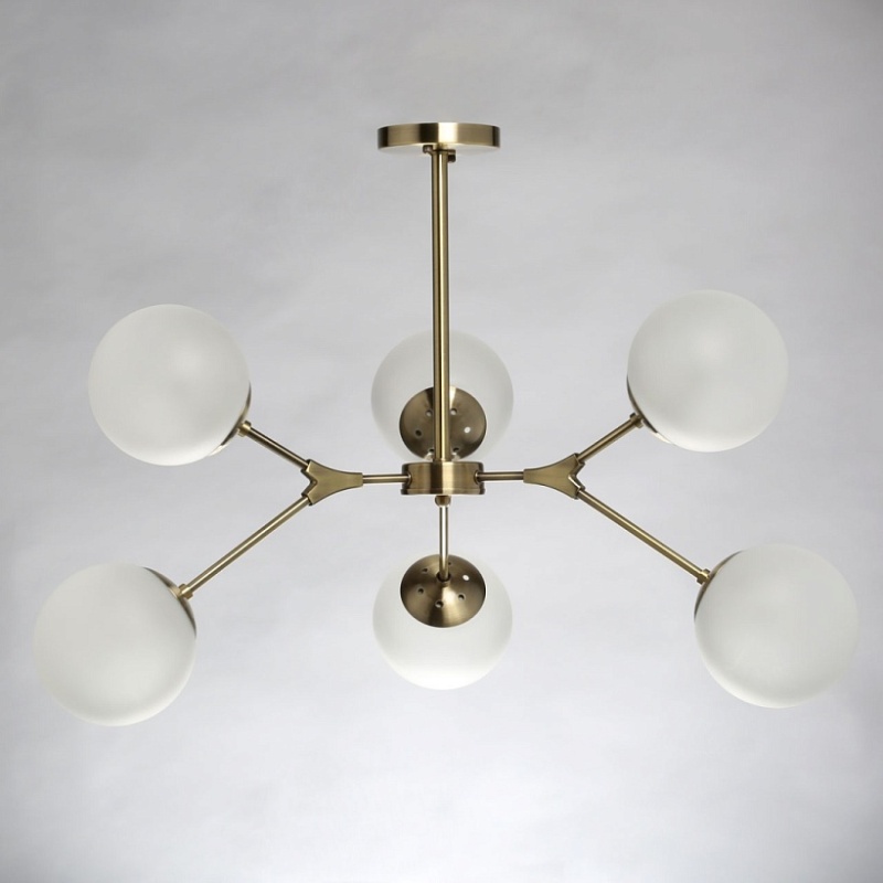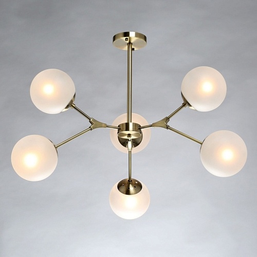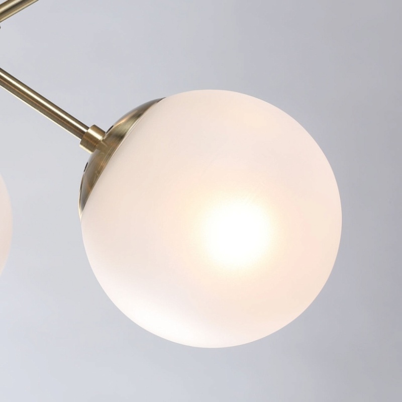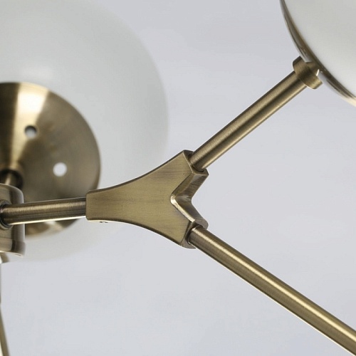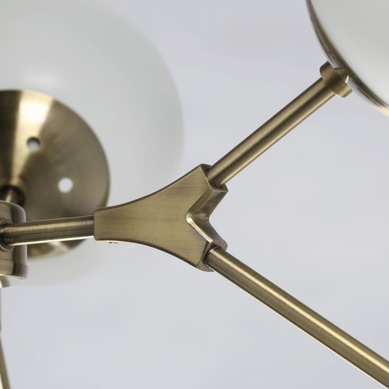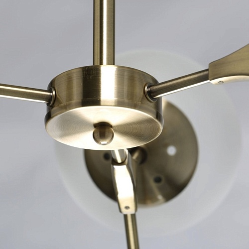 Металлическое основание светильника гальванизировано в цвет античной бронзы. Светильник декорирован стеклянными плафонами, обработанными матированием.