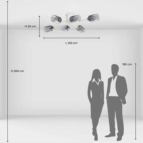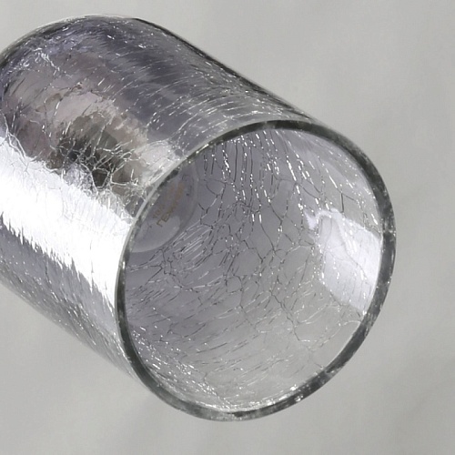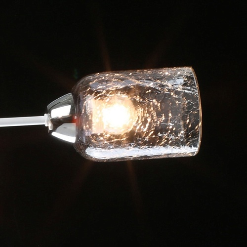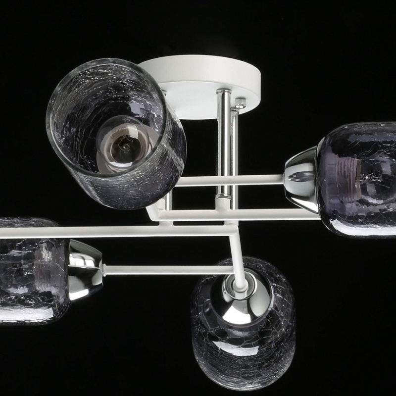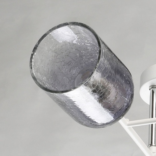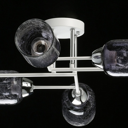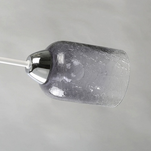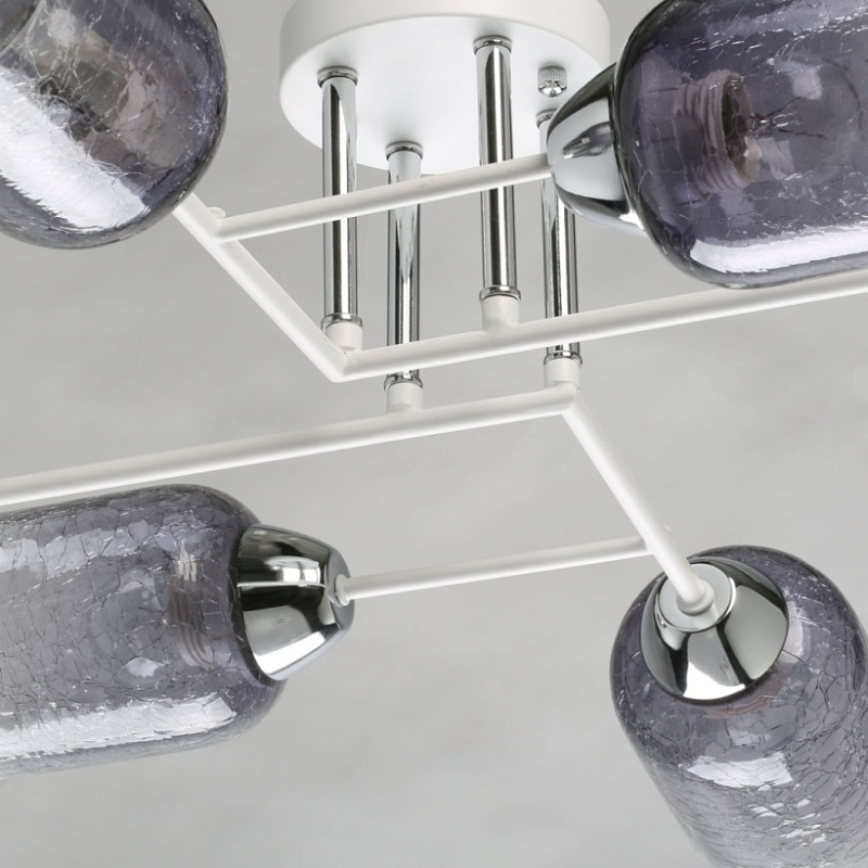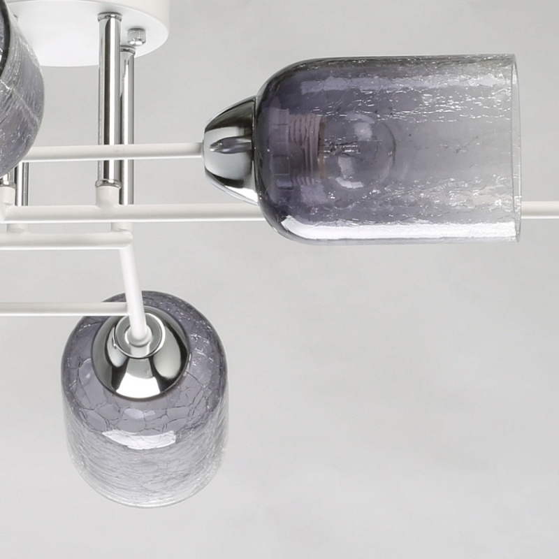 Металлическое основание потолочной люстры окрашено в белый цвет. Отдельные элементы основания гальванизированы в цвет хрома. Стеклянные плафоны выдуваются в форму, кракелированы и градиентно гальванизированы в дымчато-серый цвет.