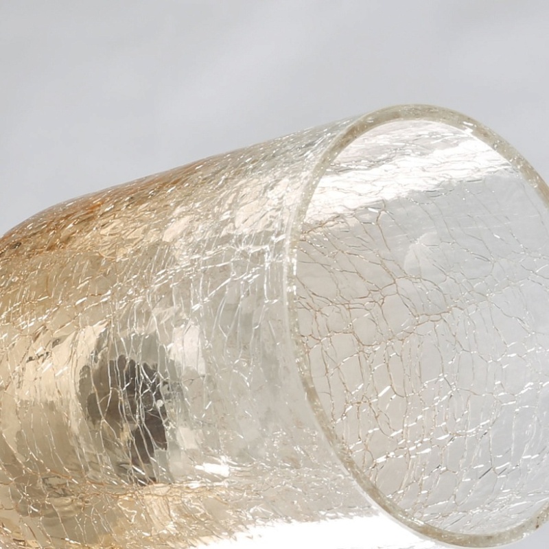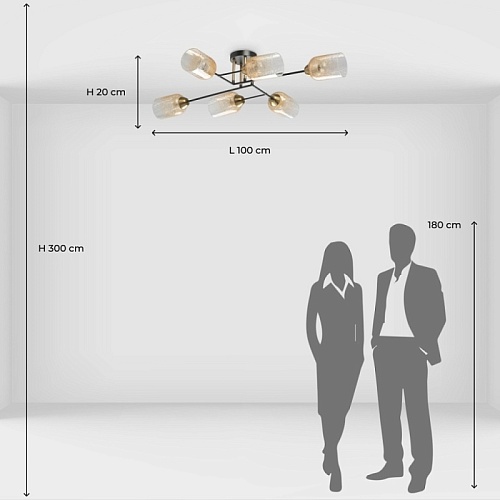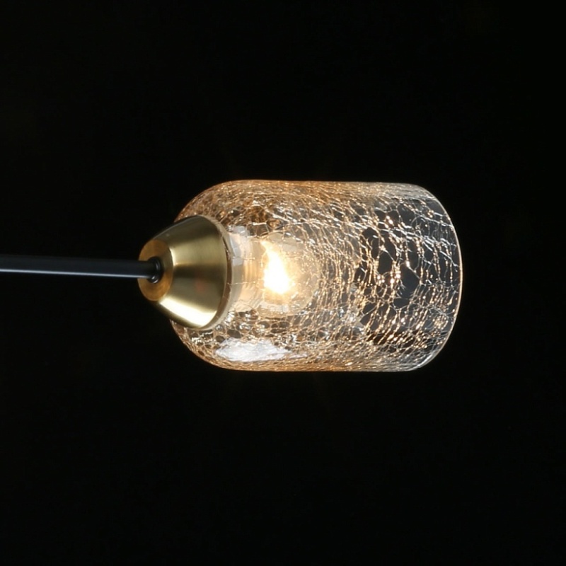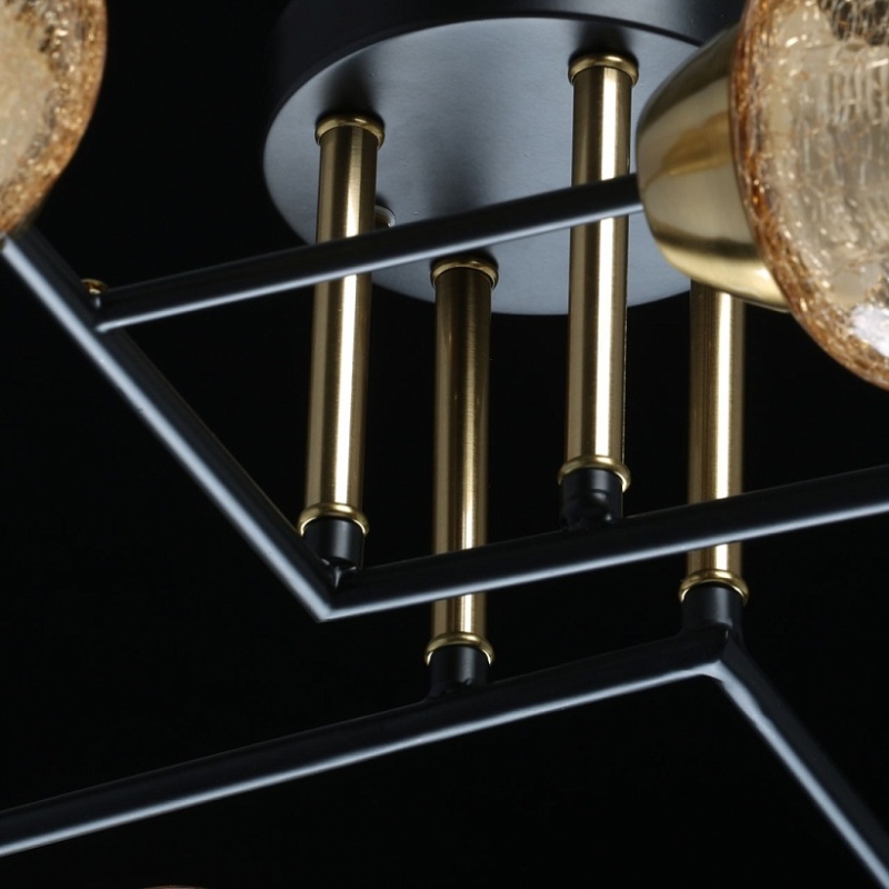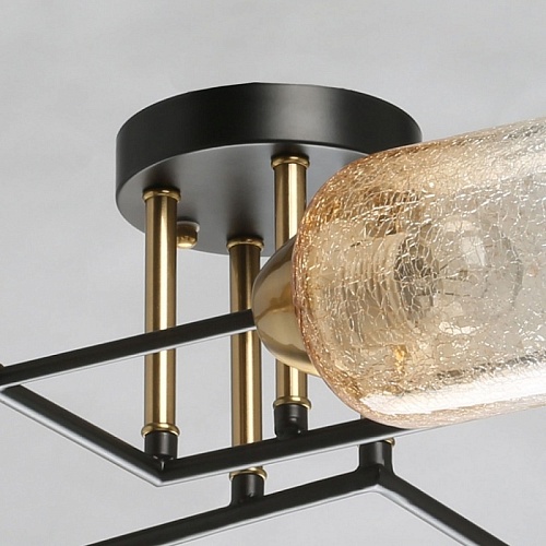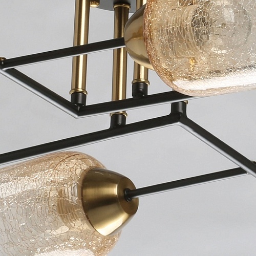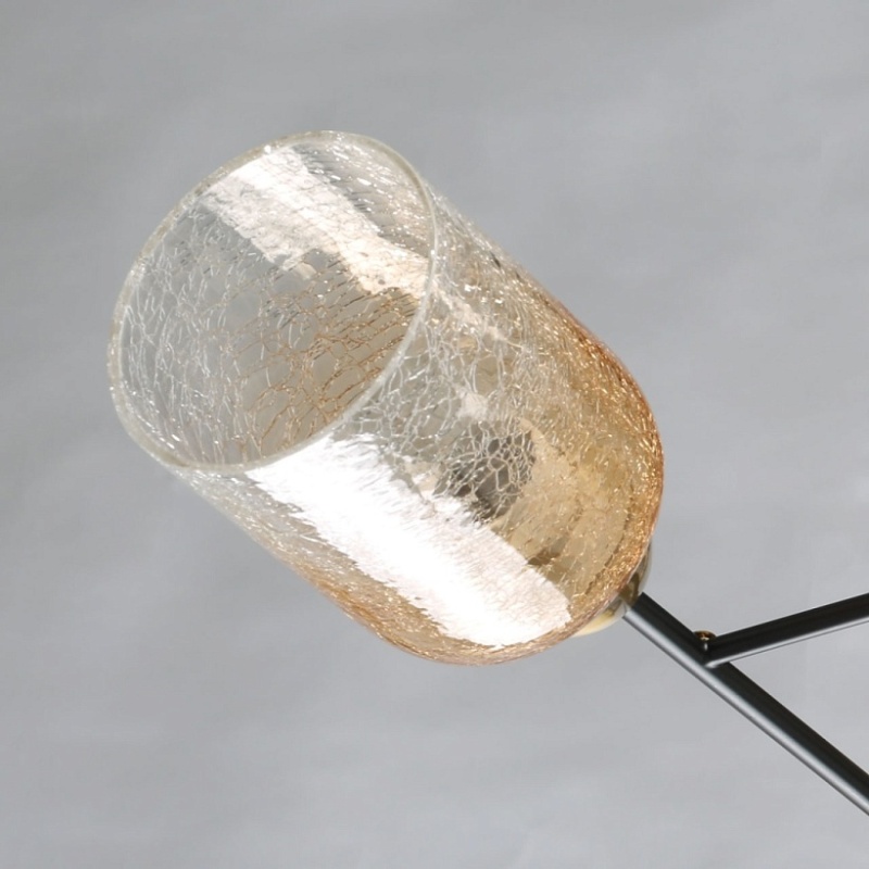 Металлическое основание потолочной люстры окрашено в черный цвет. Отдельные элементы основания гальванизированы в цвет бронзы. Стеклянные кракелированные плафоны выдуваются в форму и градиентно гальванизированы в цвет шампань.