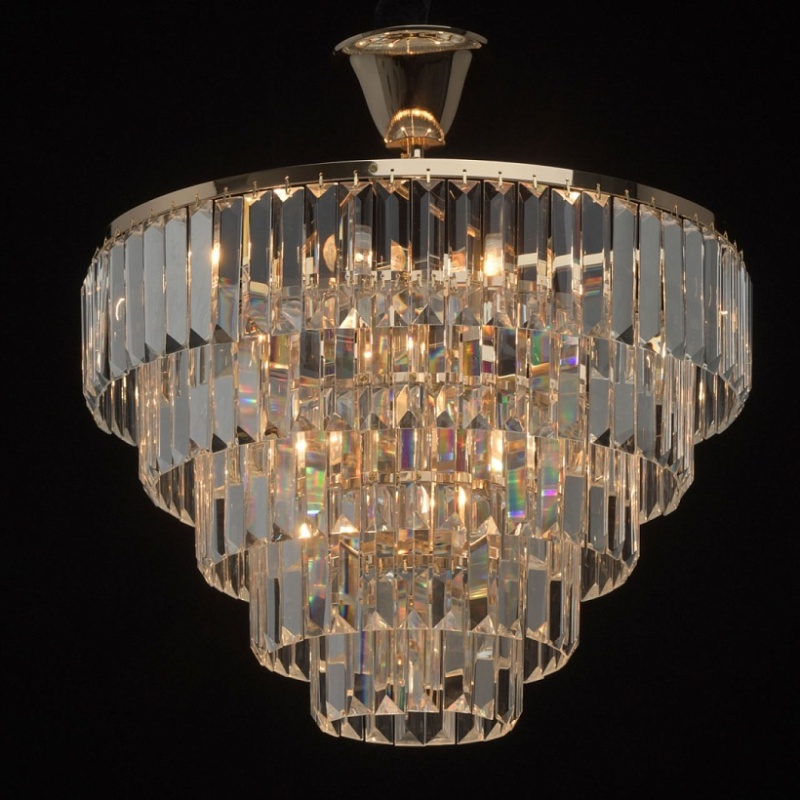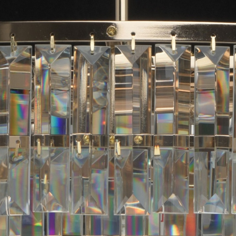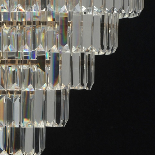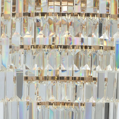 Металлическое основание гальванизировано в цвет золота. Подвески из прозрачного хрусталя прямоугольной формы.