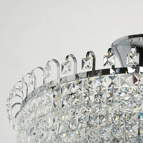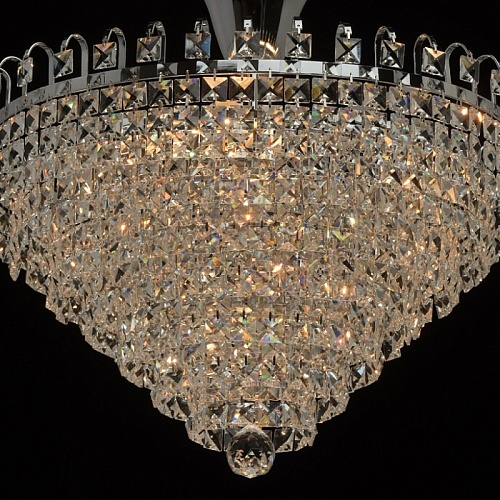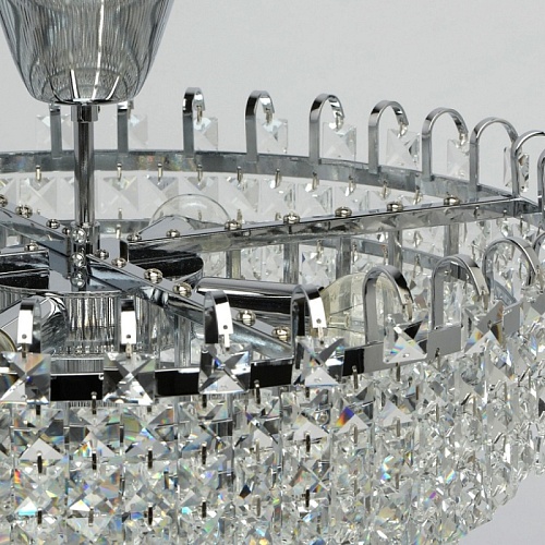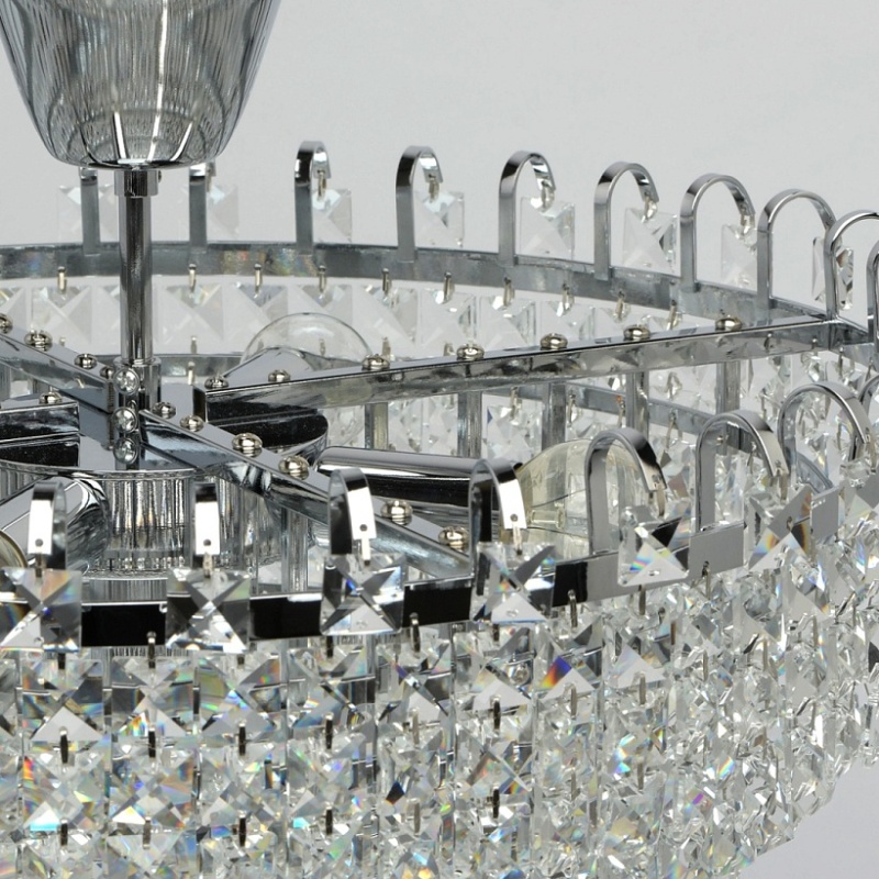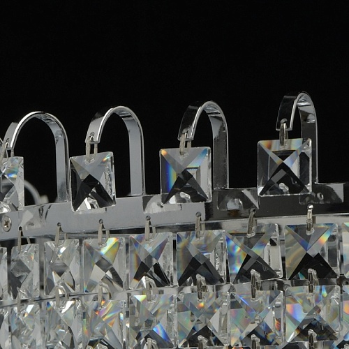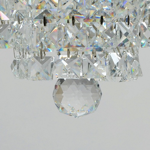 Металлическое основание гальванизировано в цвет хрома. Подвески из прозрачного хрусталя квадратной формы, центральный хрусталь в форме шара.