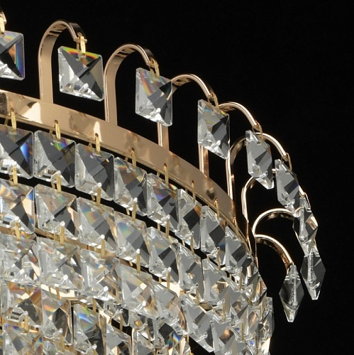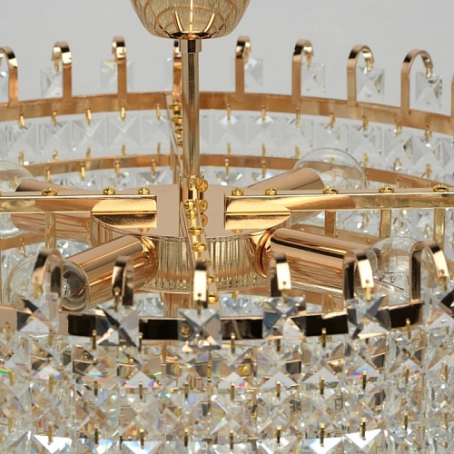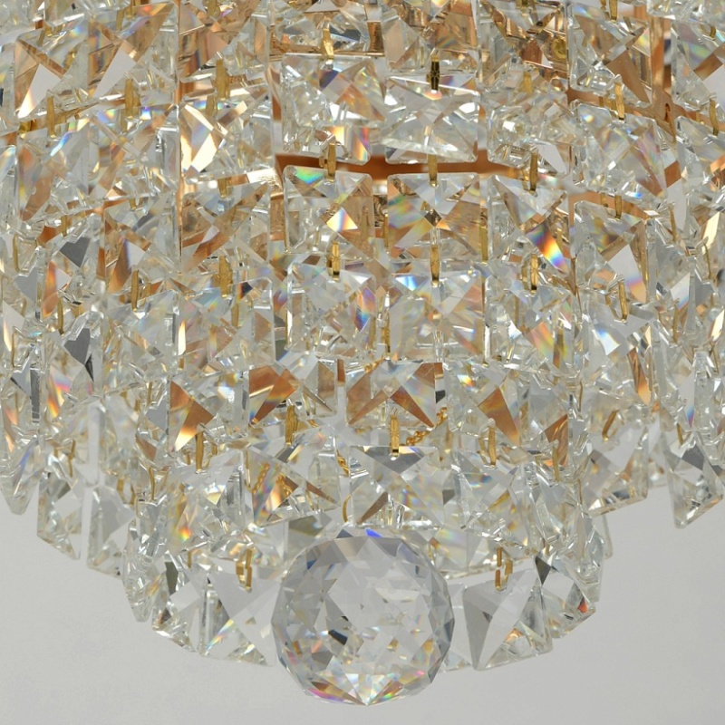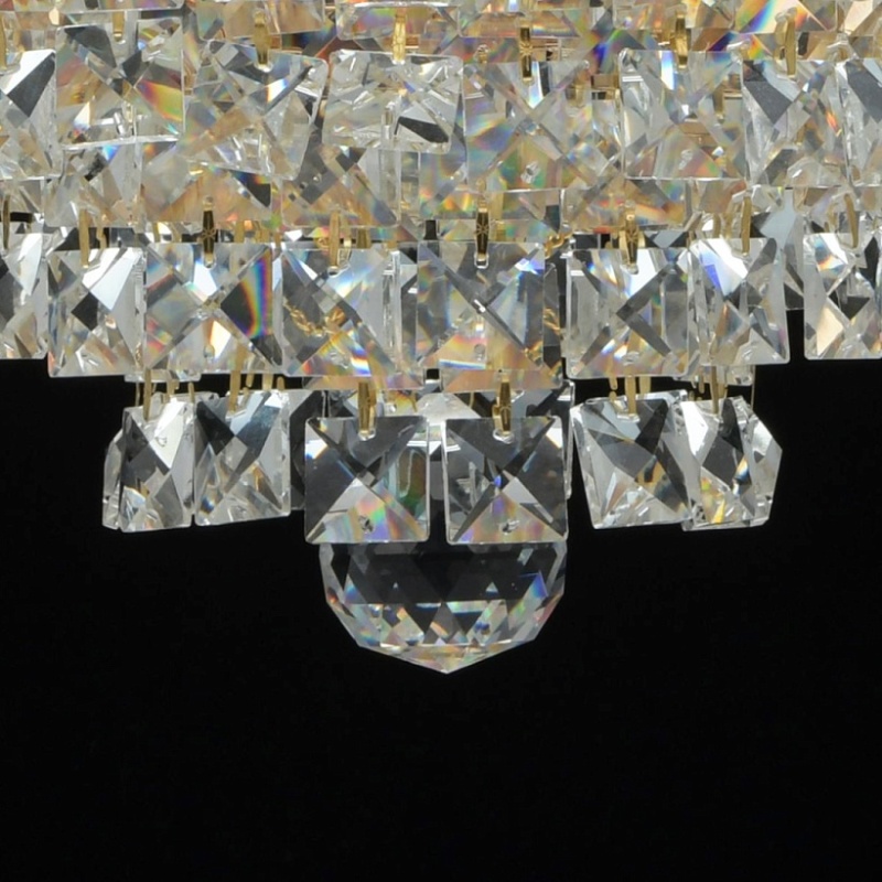 Металлическое основание гальванизировано в цвет золота. Подвески из прозрачного хрусталя квадратной формы, центральный хрусталь в форме шара.