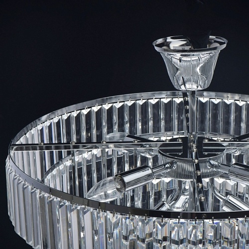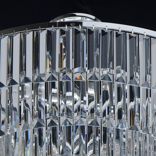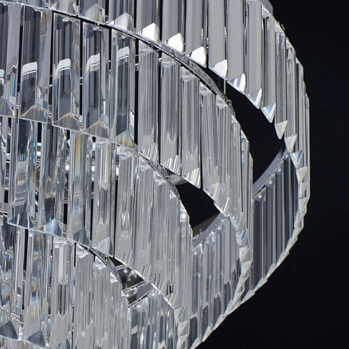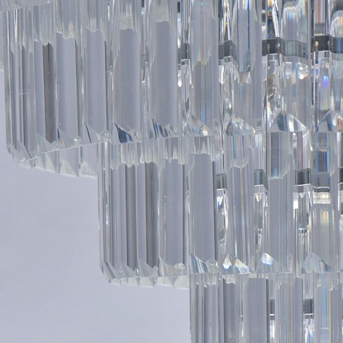 Основание светильника выполнено из металла и гальванизировано в цвет хрома. Светильник декорирован прозрачным хрусталем прямоугольной формы.