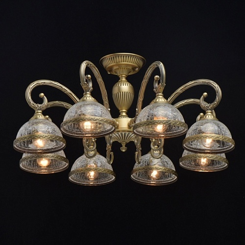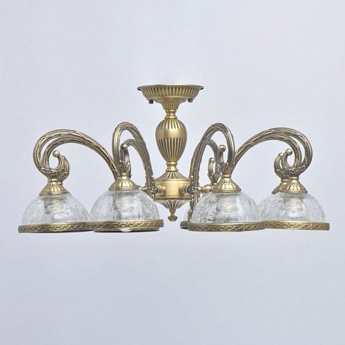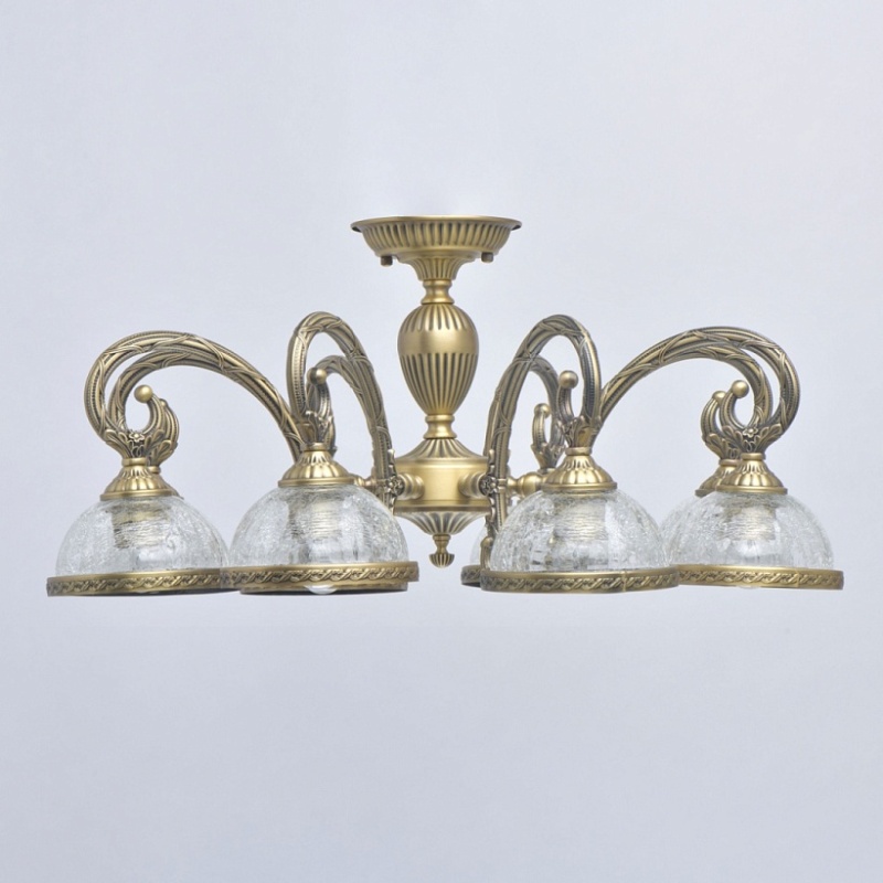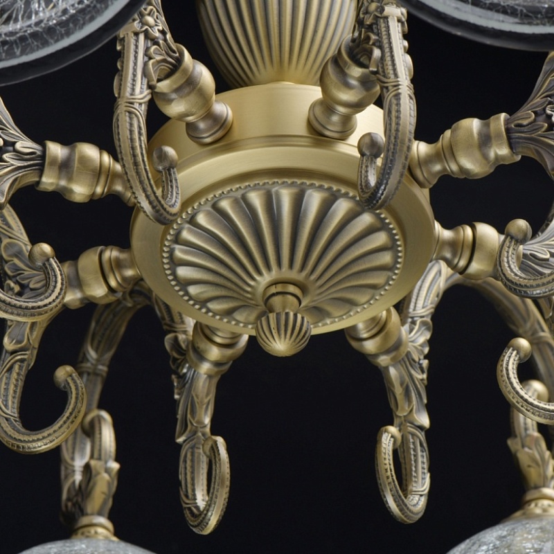 Основание светильника гальванизировано в цвет бронзы и патинировано. Рожки и центральная ось выполнены из сплава алюминия по технологии художественного литья. Стеклянные плафоны выполнены по технологии кракелирования.