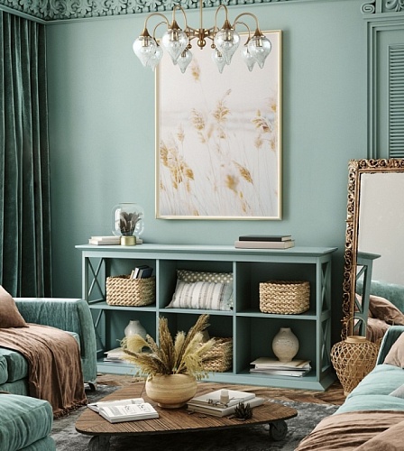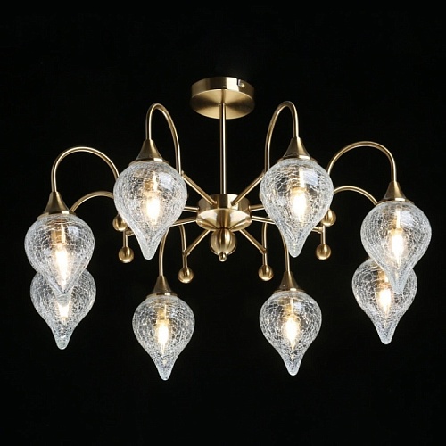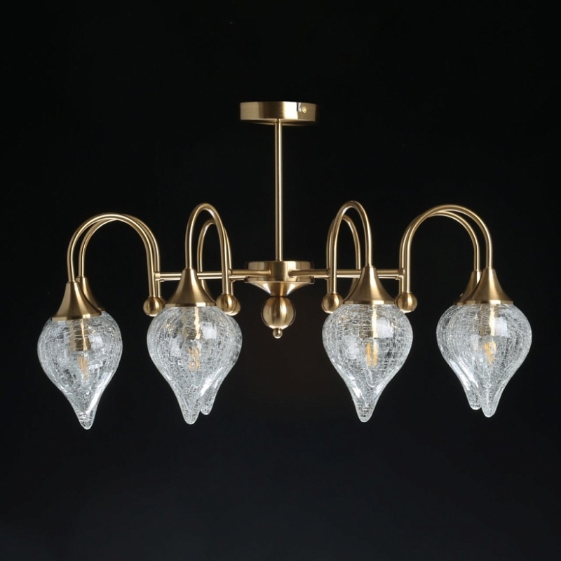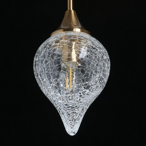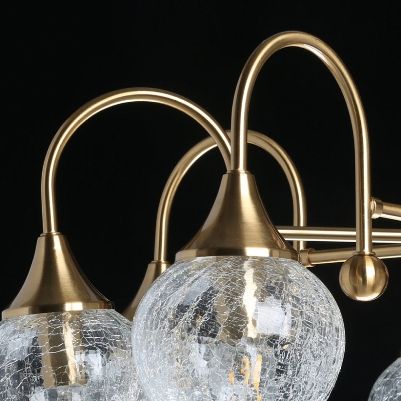 Металлическое основание гальванизировано в цвет античной бронзы. Люстра декорирована выдувными плафонами ручной работы из кракелированного стекла.