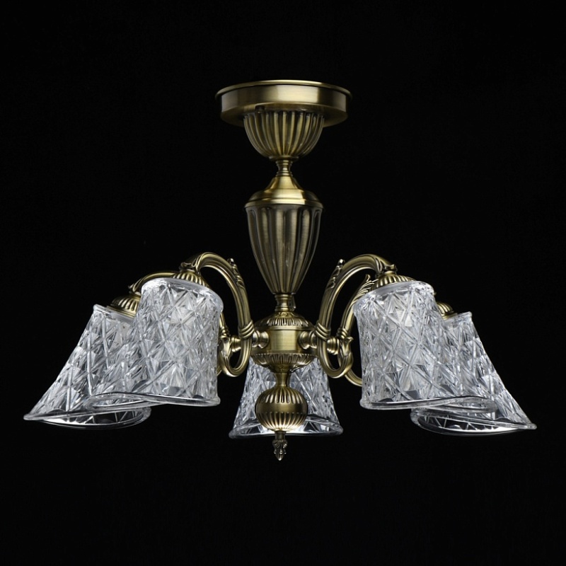 Основание светильника выполнено из комбинации сплавов металлов и гальванизировано в цвет античной бронзы. Рожки выполнены по технологии художественного литья. Светильник декорирован стеклянными плафонами, отлитыми в сложную форму.
