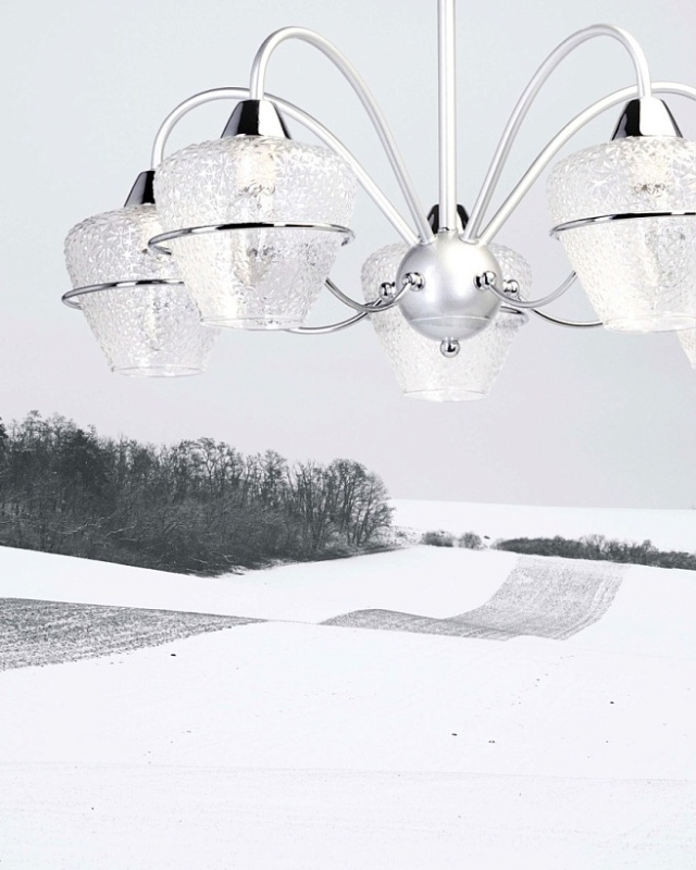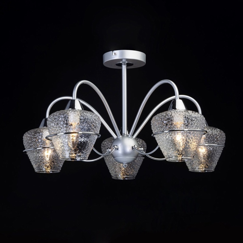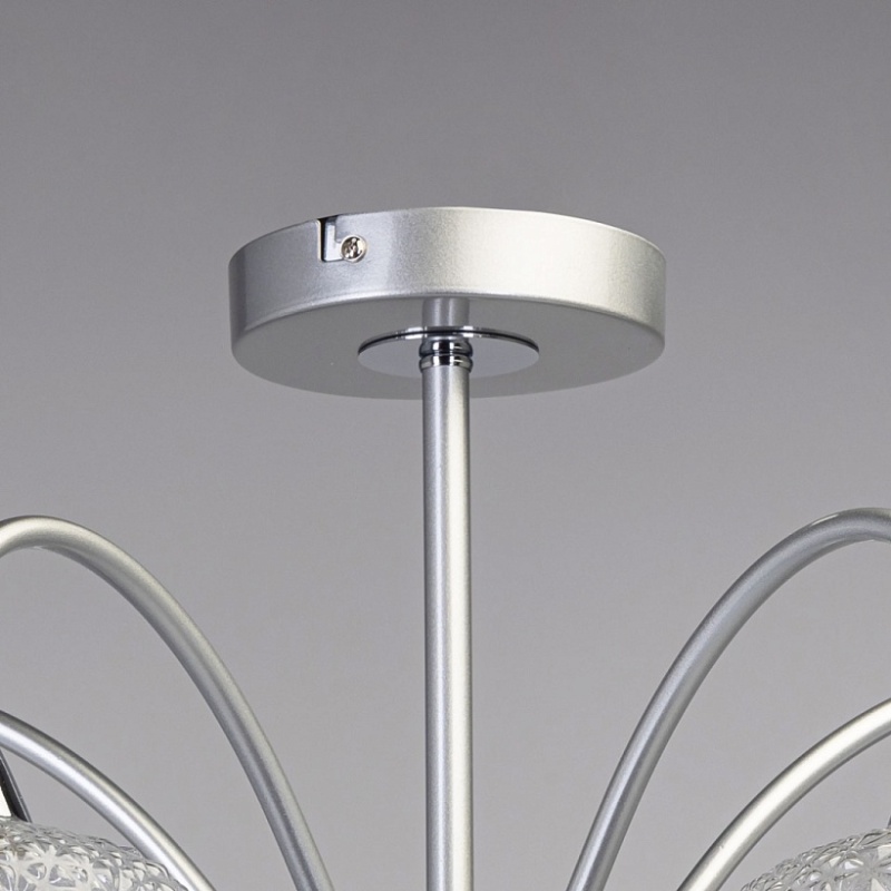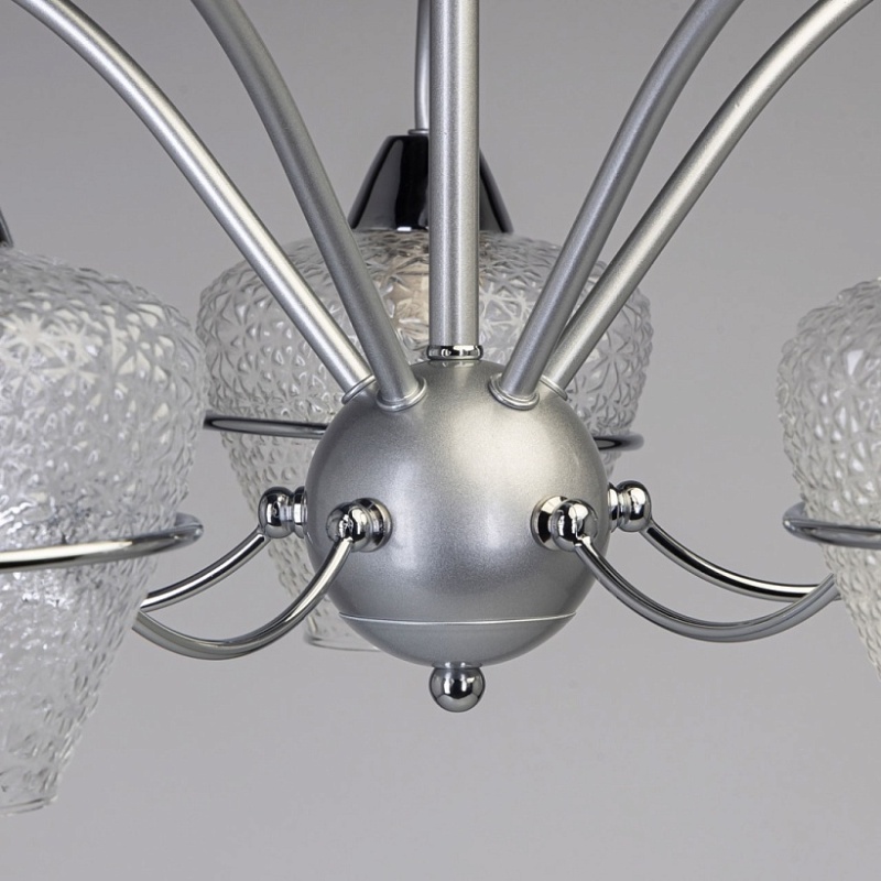 Металлическое основание потолочной люстры окрашено в серебряный цвет. Отдельные элементы основания гальванизированы в цвет хрома. Люстра декорирована плафонами из фактурного стекла.