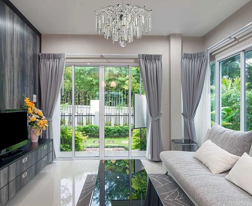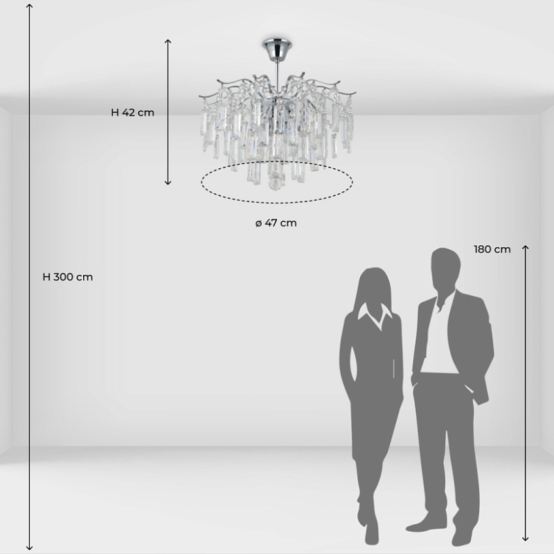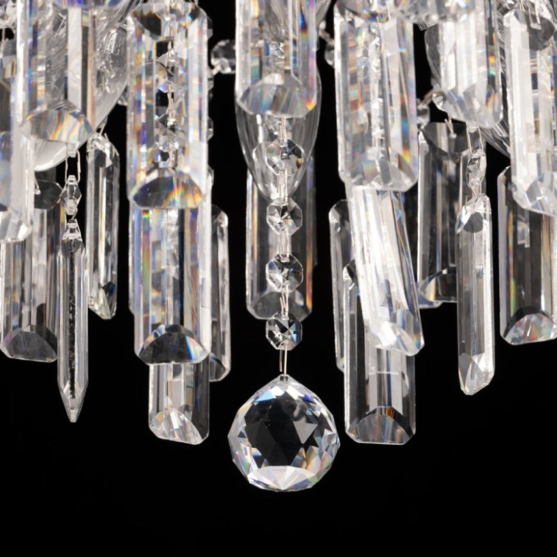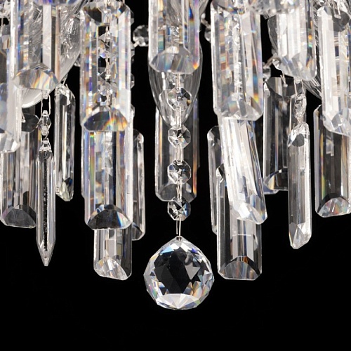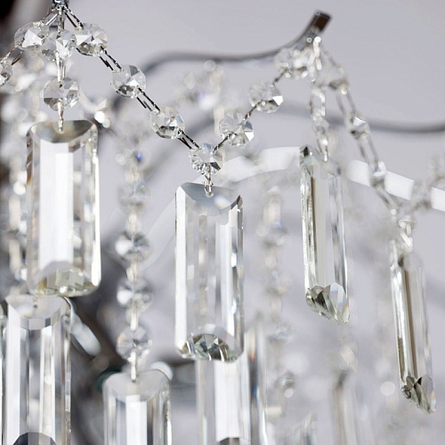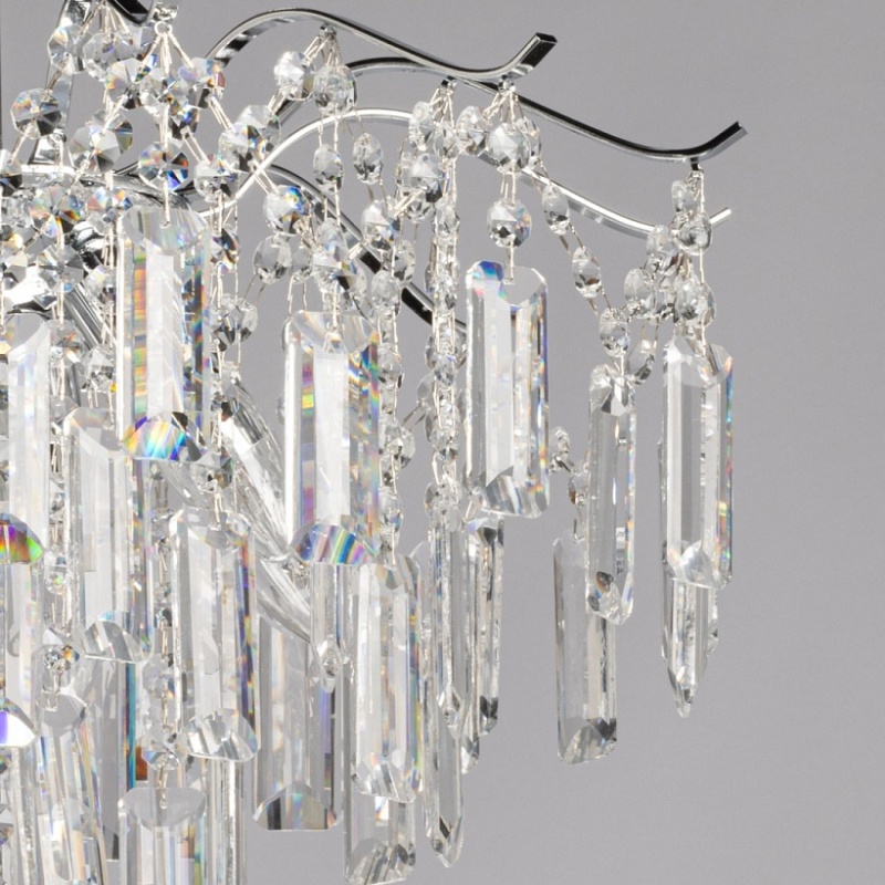 Металлическое основание потолочной люстры гальванизировано в цвет хрома. Светильник декорирован прозрачным хрусталем разной формы.