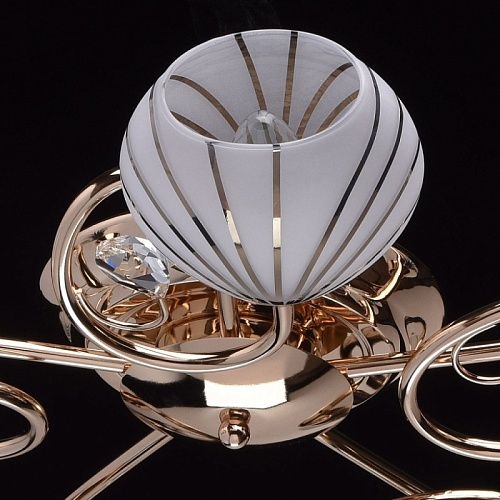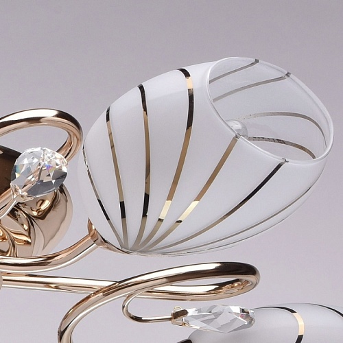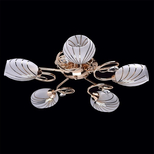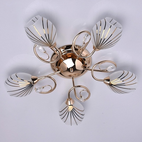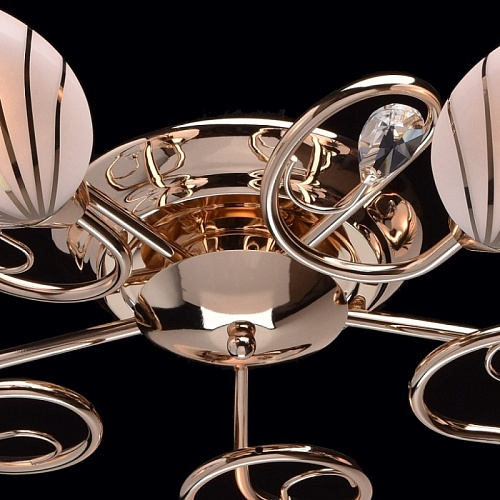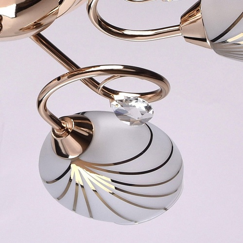 Основание светильника выполнено из металла и гальванизировано в цвет золота. Потолочная чаша, корпус и держатели плафонов изготовлены по технологии обработки на токарном станке, рожки и завитки изогнуты по технологии проката на роликовом станке.Светильник декорирован стеклянными плафонами, отлитыми в форму. Плафоны матированы, гальванизированы по трафарету в цвет золота. Края плафонов обработаны по технологии оплавления. Декоративные элементы: прозрачное хрустальное стекло миндалевидной формы.
