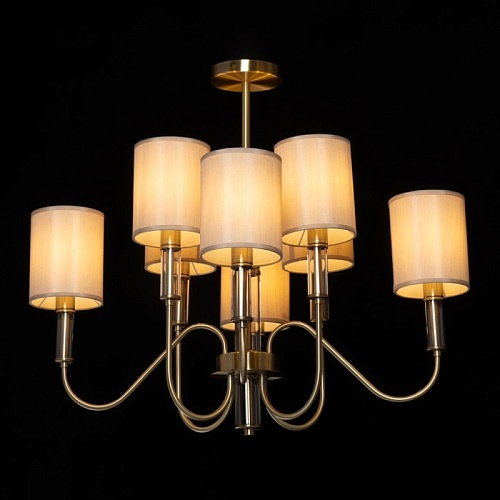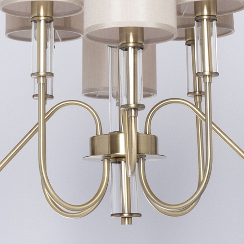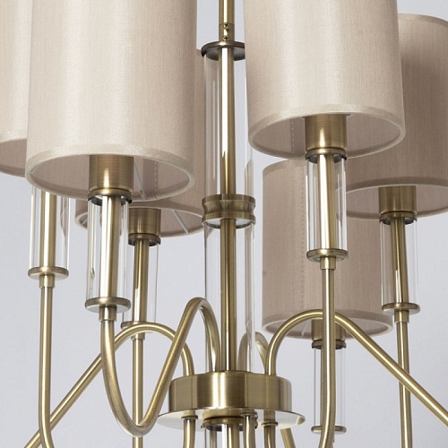 Металлическое основание подвесной люстры гальванизировано в цвет античной бронзы. Традиционные источники света закрыты двухслойными текстильными абажурами цвета кофе с молоком и термостойким акрилом внутри. Абажуры отделаны кантами и прошиты. Светильник декорирован элементами из прозрачного стекла вытянутой формы.