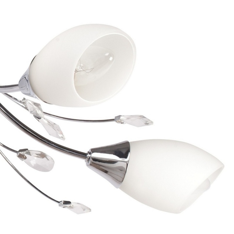 Основание светильника выполнено из сплава металла и гальванизировано в цвет хрома. Светильник декорирован стеклянными плафонами, обработанными по технологии пескоструйного матирования и хрустальными подвесками стандартного качества.