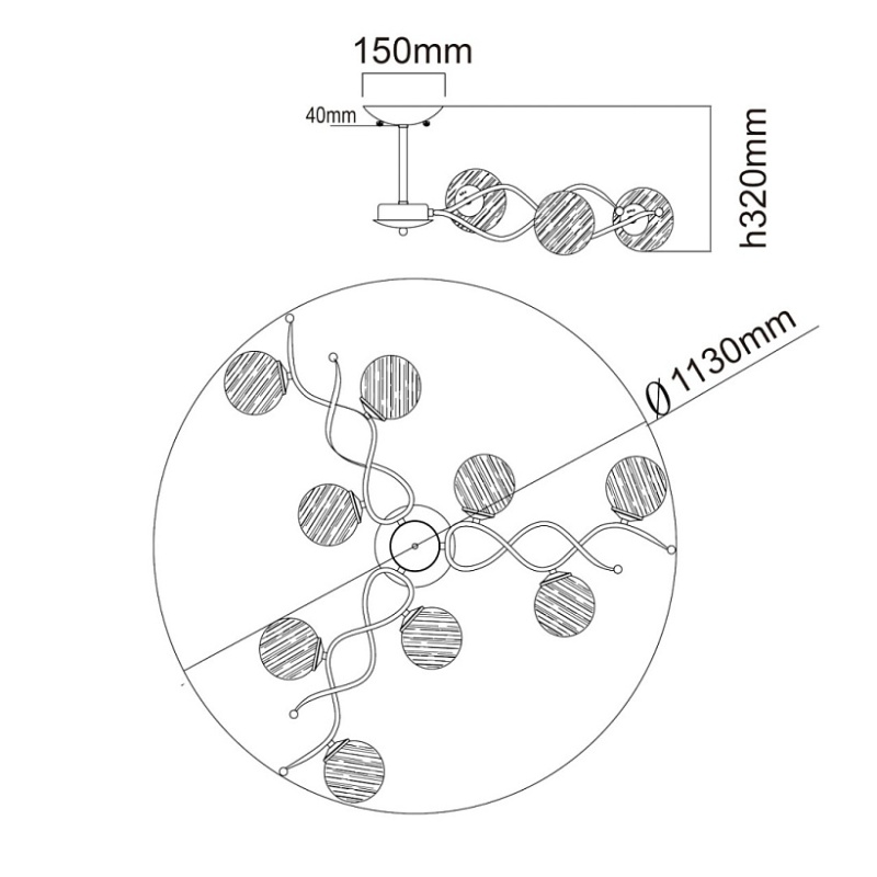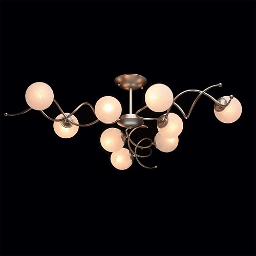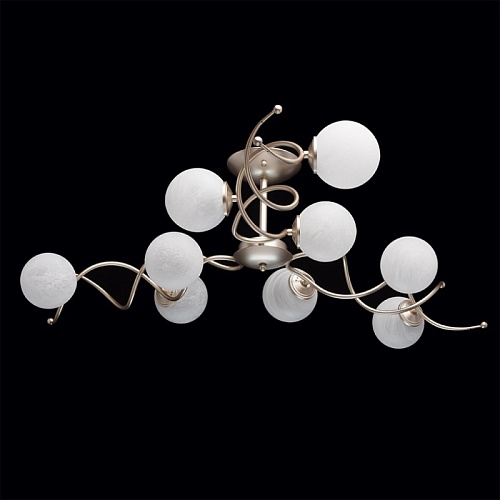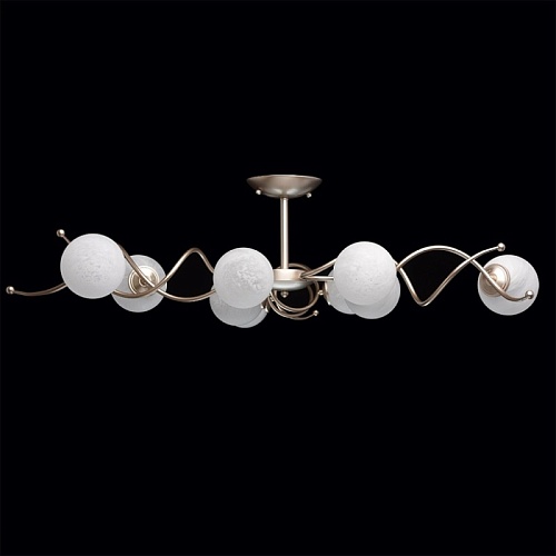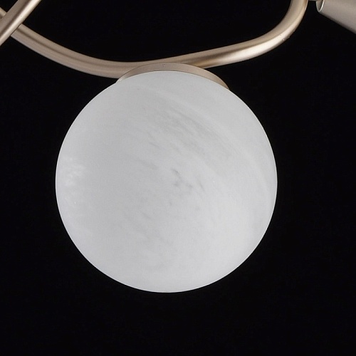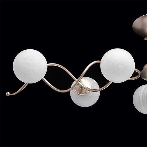 Основание, металл окрашено в цвет перламутрового золота. Основание и декоративная розетка выполнены по технологии токарной обработки. Плафоны: из алебастрового стекла, обработаны по технологии пескоструйного матирования. Декор: металлические элементы изогнуты на роликовом станке окрашены в цвет арматуры.