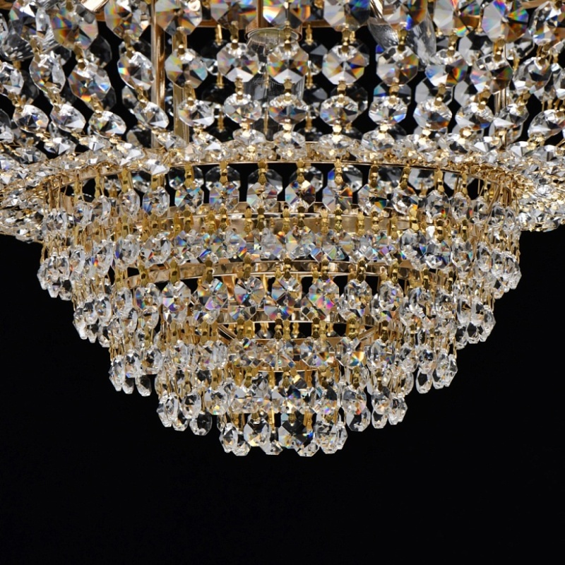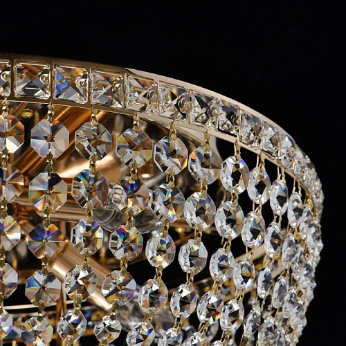 Основание светильника выполнено из металла и гальванизировано в цвет золота. Светильник декорирован прозрачным хрусталем.