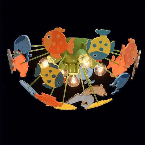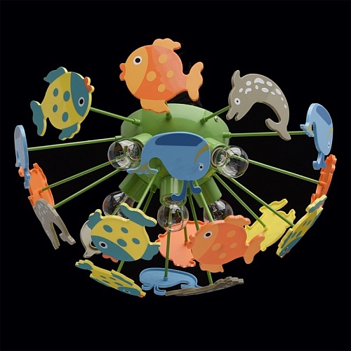 Основание светильника выполнено из сплава металла и окрашено в зеленый цвет. Светильник декорирован фигурками рыбок из высококачественного акрила, окрашенными в разные цвета.