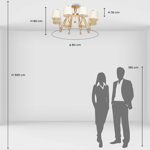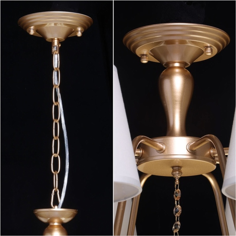 Металлическое основание подвесной люстры окрашено в цвет перламутрового золота. Заменяемые источники света закрыты текстильными абажурами бежевого цвета. С внутренней стороны текстиль защищен прозрачным термостойким акрилом. Абажуры отделаны кантами и прошиты. Люстра декорирована хрусталем, гальванизированным в цвет топаз.