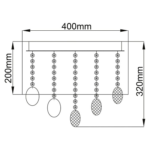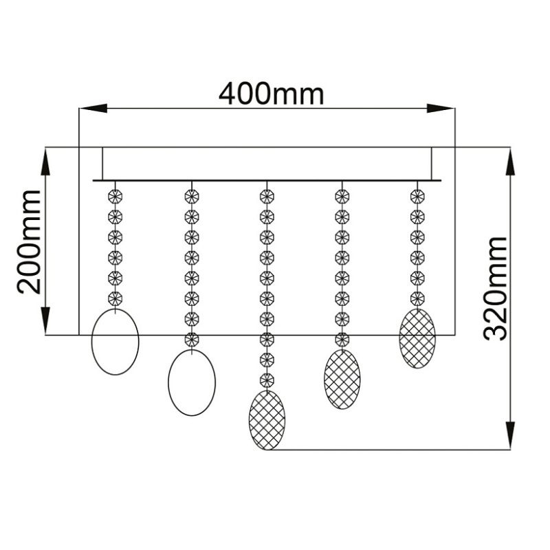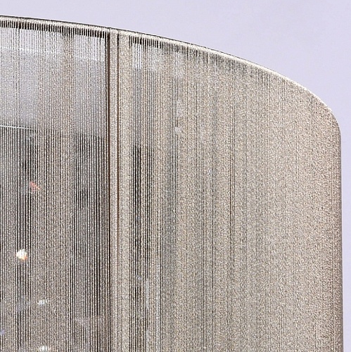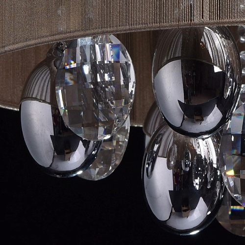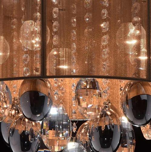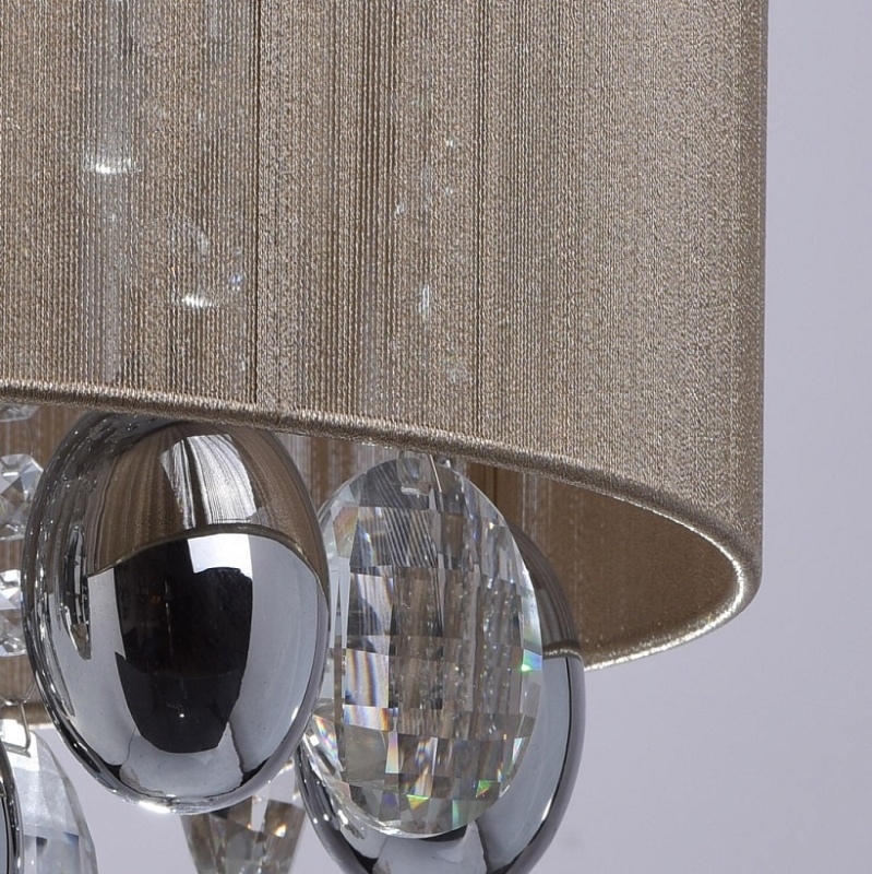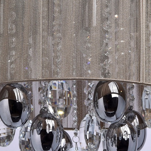 Корпус светильника выполнен из сплава металла и окрашен в цвет серебра. Корпус закрыт листом из полированной нержавеющей стали. Каркас абажура обтянут текстильной нитью золотого цвета. Светильник декорирован крупными подвесками из стекла, гальванизированного в цвет хрома и подвесками из хрусталя сложной огранки.
