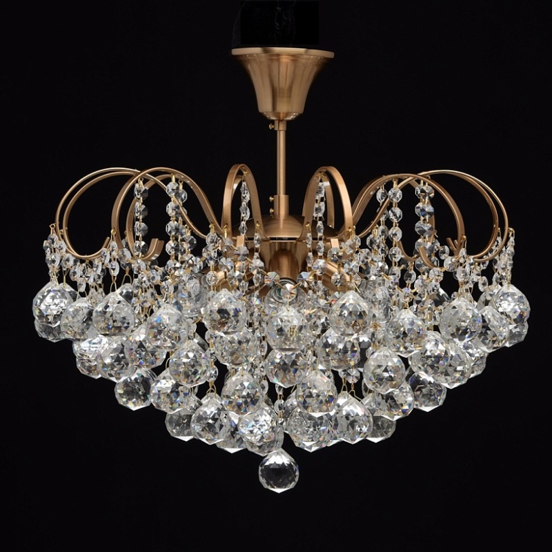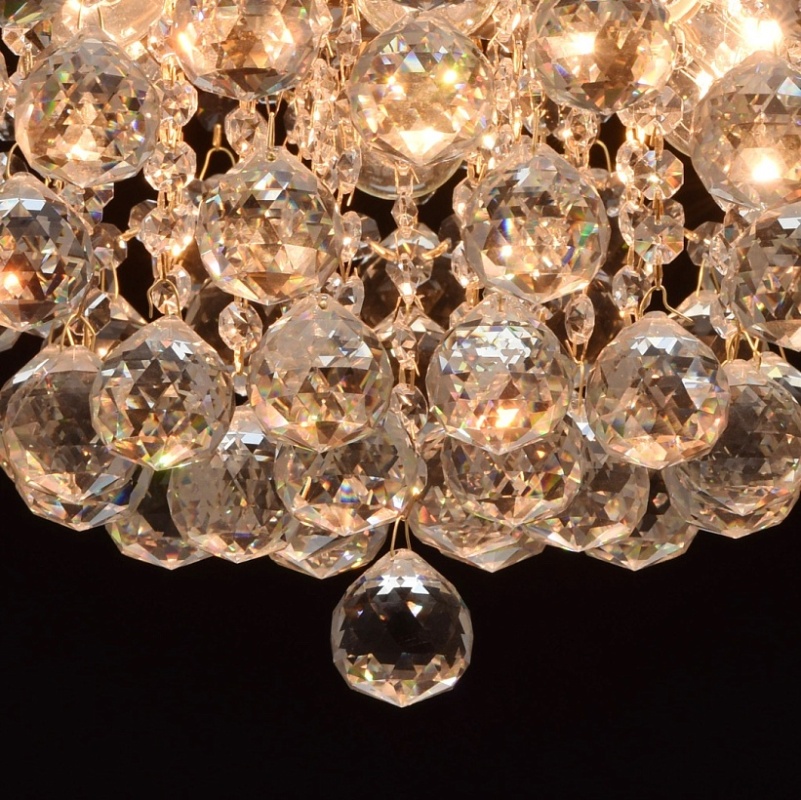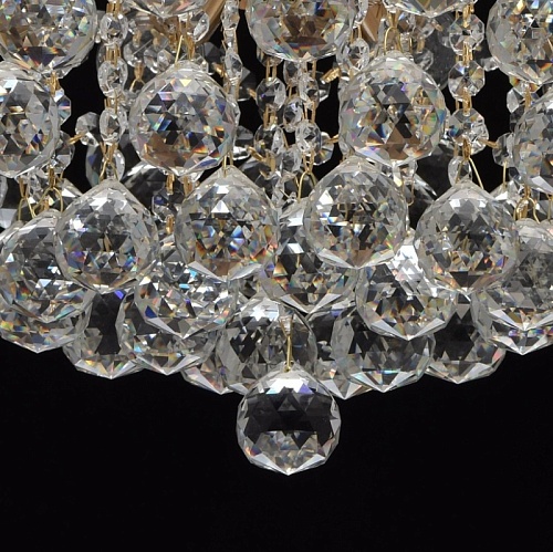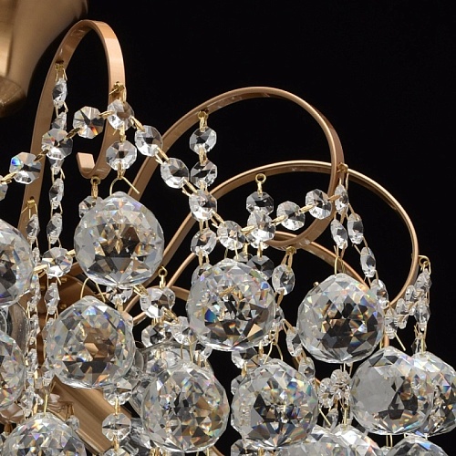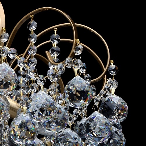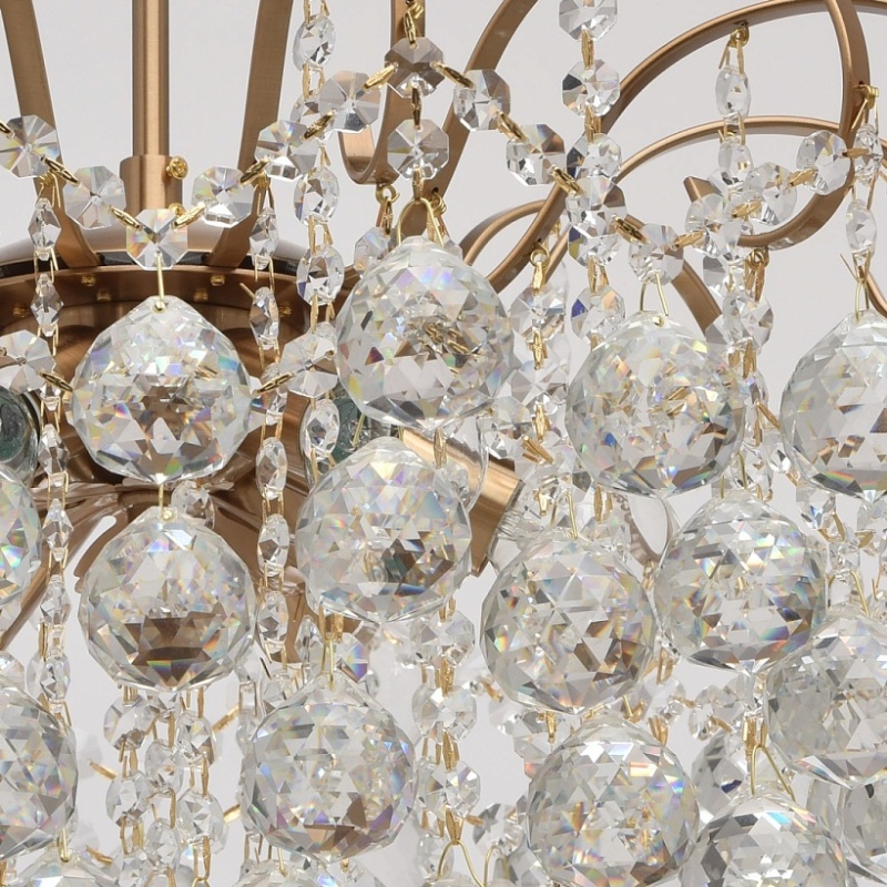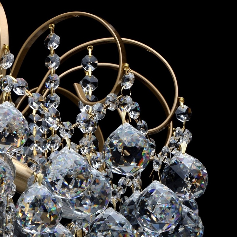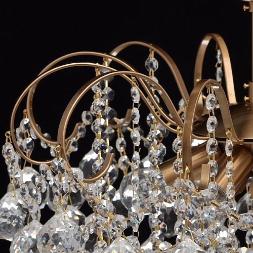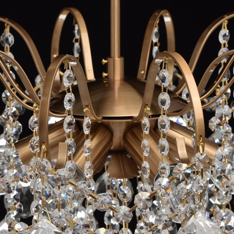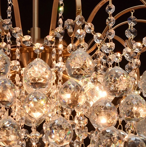Арматура светильника выполнена из сплава металла и гальванизирована в цвет медовой бронзы. Светильник декорирован подвесами из хрусталя сложной огранки и хрустальными октагонами.