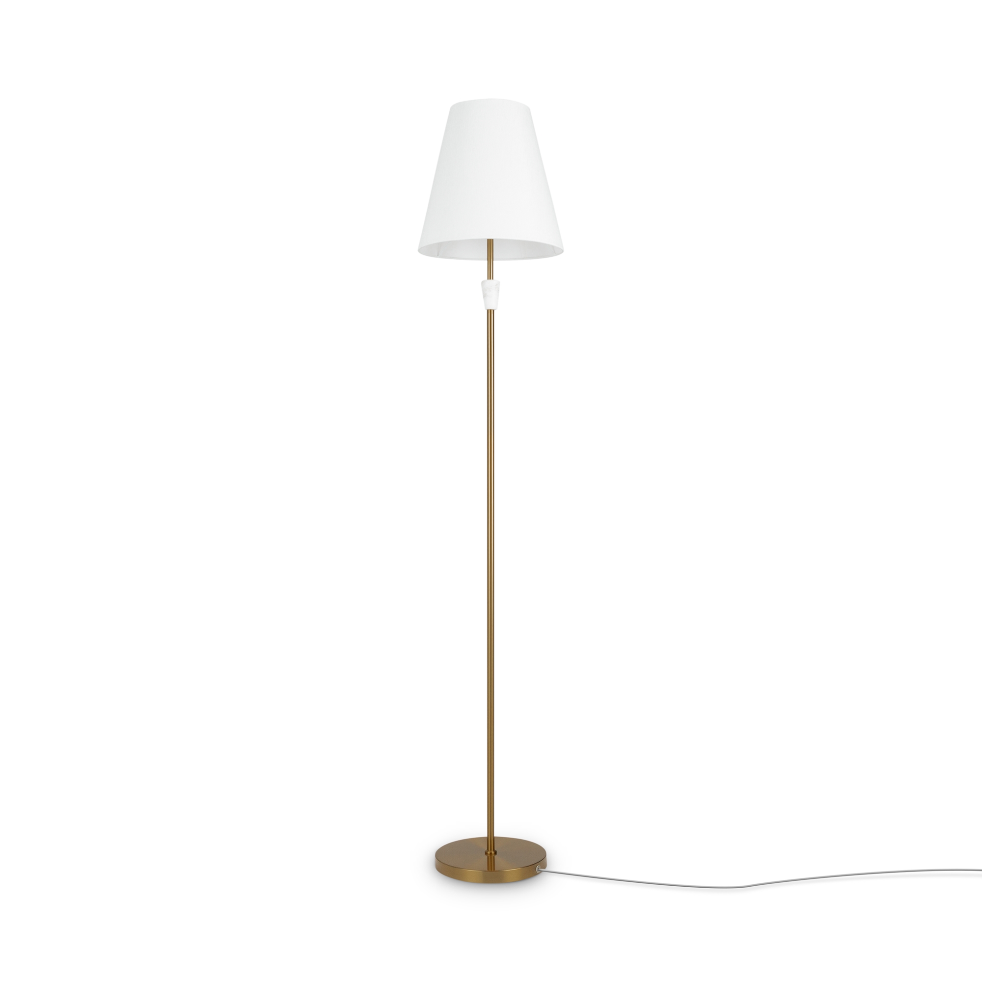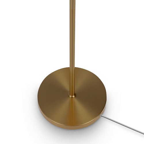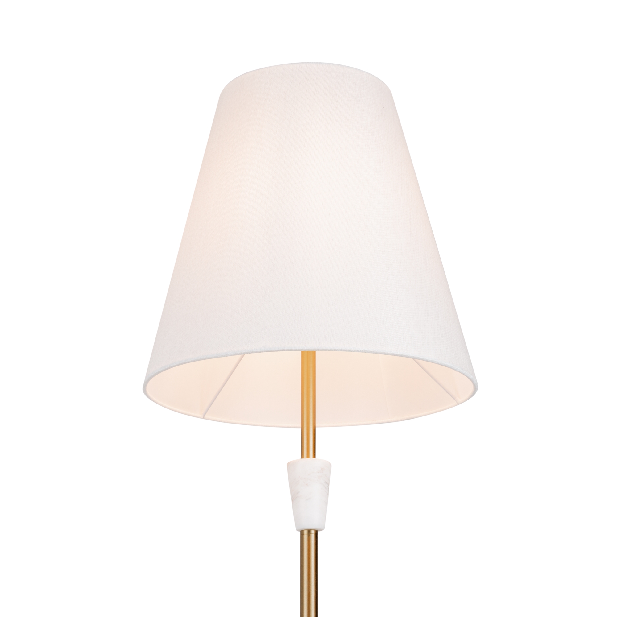 Металлическая арматура в цвете латунь. Дополнительные элементы — минималистичные вставки из натурального белого мрамора. Белые абажуры из ткани в форме конуса. Источник света — лампа с цоколем Е14 или Е27.