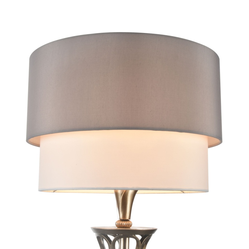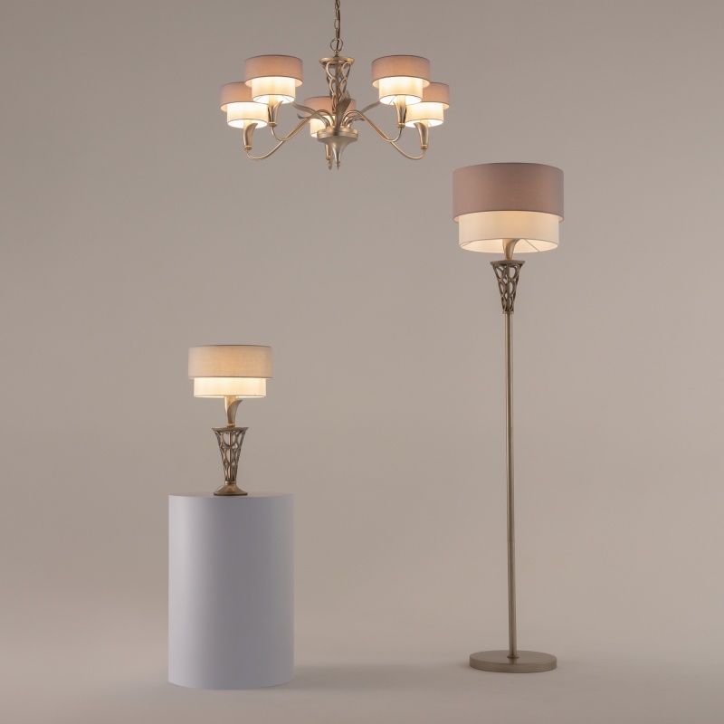 Металлическая арматура окрашена в цвет античного серебра. Двойные абажуры из хлопка на ПВХ, комбинация белого и серого цвета. Флористический декор. Высота люстр регулируетс
