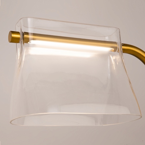 Цвет металлической арматуры — латунь с сатинированным финишем, плафоны — прозрачное стекло. Источник света: LED. Цветовая температура светильников 3000К, угол рассеивания — 120 градусов. Настенные бра и подвесные светильники оснащены регулируемым проводом длиной до 3 метров, что позволяет использовать их в помещениях с высокими потолками.