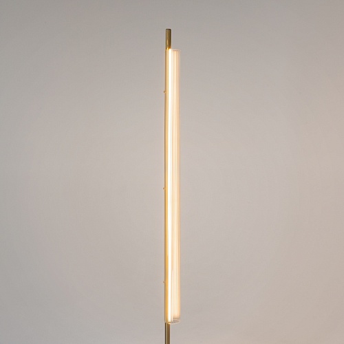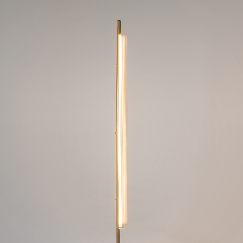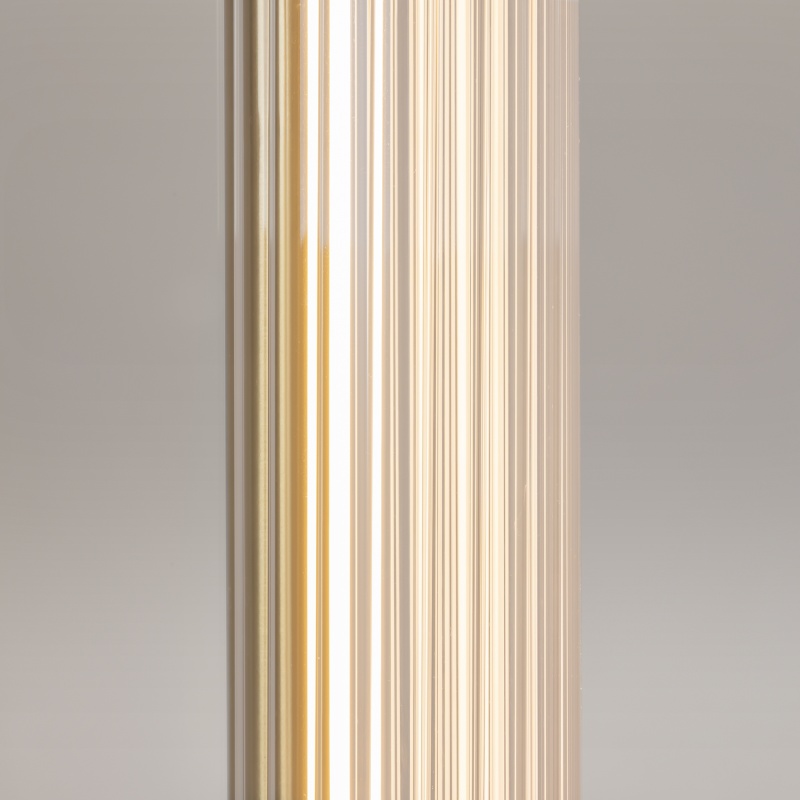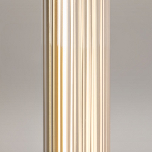 Арматура из металла, цвет - латунь с сатиновым финишем. Плафон из рифленого прозрачного стекла. LED-источник света. Теплая цветовая температура 3000К. Регулируемый по длине провод 3 метра у подвесного светильника. Подходит для помещений с высокими потолками. Торшер с push-кнопкой на проводе для удобного включения и выключения.