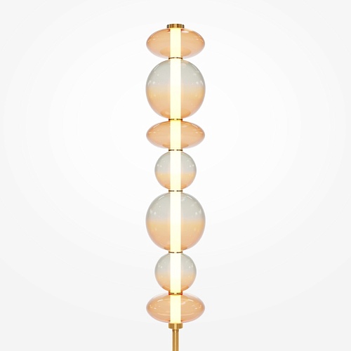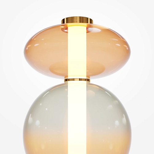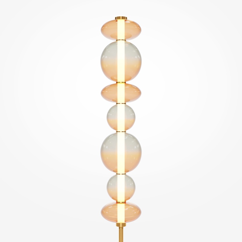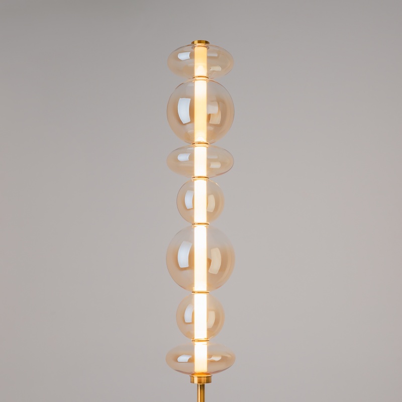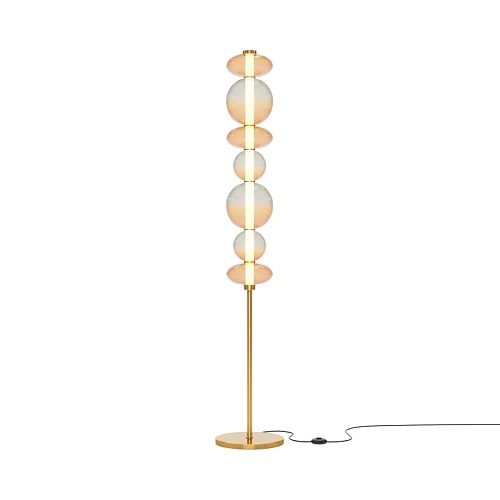 Светильники с тонированными выдувными стеклянными плафонами (дымчатыми или янтарными) и металлической арматурой (черной или цвета латуни). Окрашивание плафонов градиентное. Источник света: LED. Световой элемент установлен внутри акрилового рассеивателя. Цветовая температура источника света – 3000К, угол рассеивания — 120°. Торшеры снабжены Push-кнопкой на проводе.