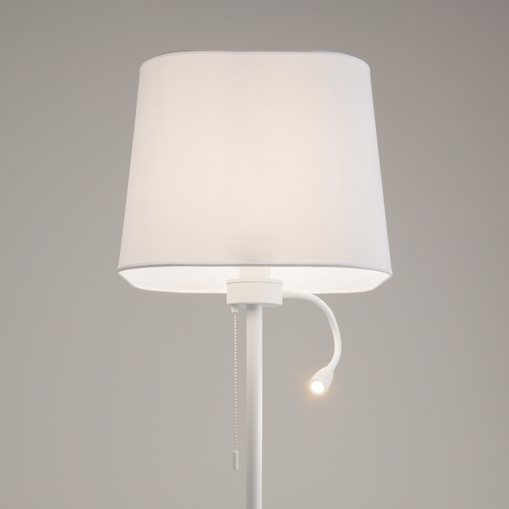 Металлическая арматура в белом и черном цвете. Материал абажура – текстиль, нанесенный на ПВХ, оттенки – белый и черный. LED-элемент для локальной под светки расширяет функционал модели.