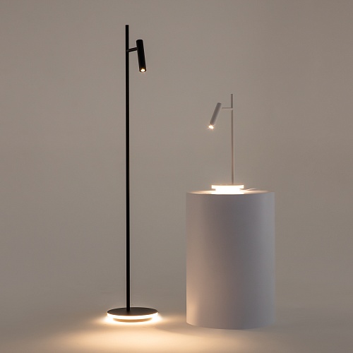Металлический корпус в черном и белом оттенках. Вращающийся плафон-цилиндр позволяет регулировать направление светового потока. Декоративная подсветка основания. LED источник света, цветовая температура 3000К.