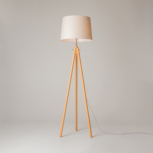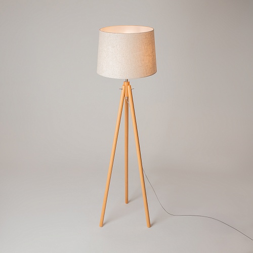 Торшер на треноге. Материал основания – дерево и металл. Декоративные бараш ковые винты. Абажур из хлопка, нанесенного на ПВХ, цвета – бежевый, черный, белый. Источник света - лампа с цоколем Е27.