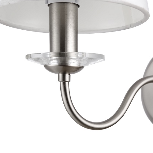 Металлическая арматура в двух оттенках на выбор: латунь и никель. Абажуры – текстиль белого цвета. Декоративные элементы из прозрачного стекла. Источник света – лампа с цоколем E14.