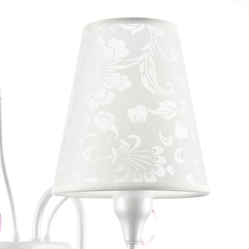 Серия выполнена в классическом стиле. В дизайне люстр и бра сделан легкий цветовой акцент на цепочки из мелких бусин и прозрачные розовые кристаллы. Торшер и настольная лампа имеют строгий и лаконичный дизайн. Все изделия серии, кроме бра, в основании декорированы украшением в виде большого круглого граненого кристалла. Отделка арматуры - жемчужного белого цвета, абажуры сделаны из сатина с цветочным рисунком.
