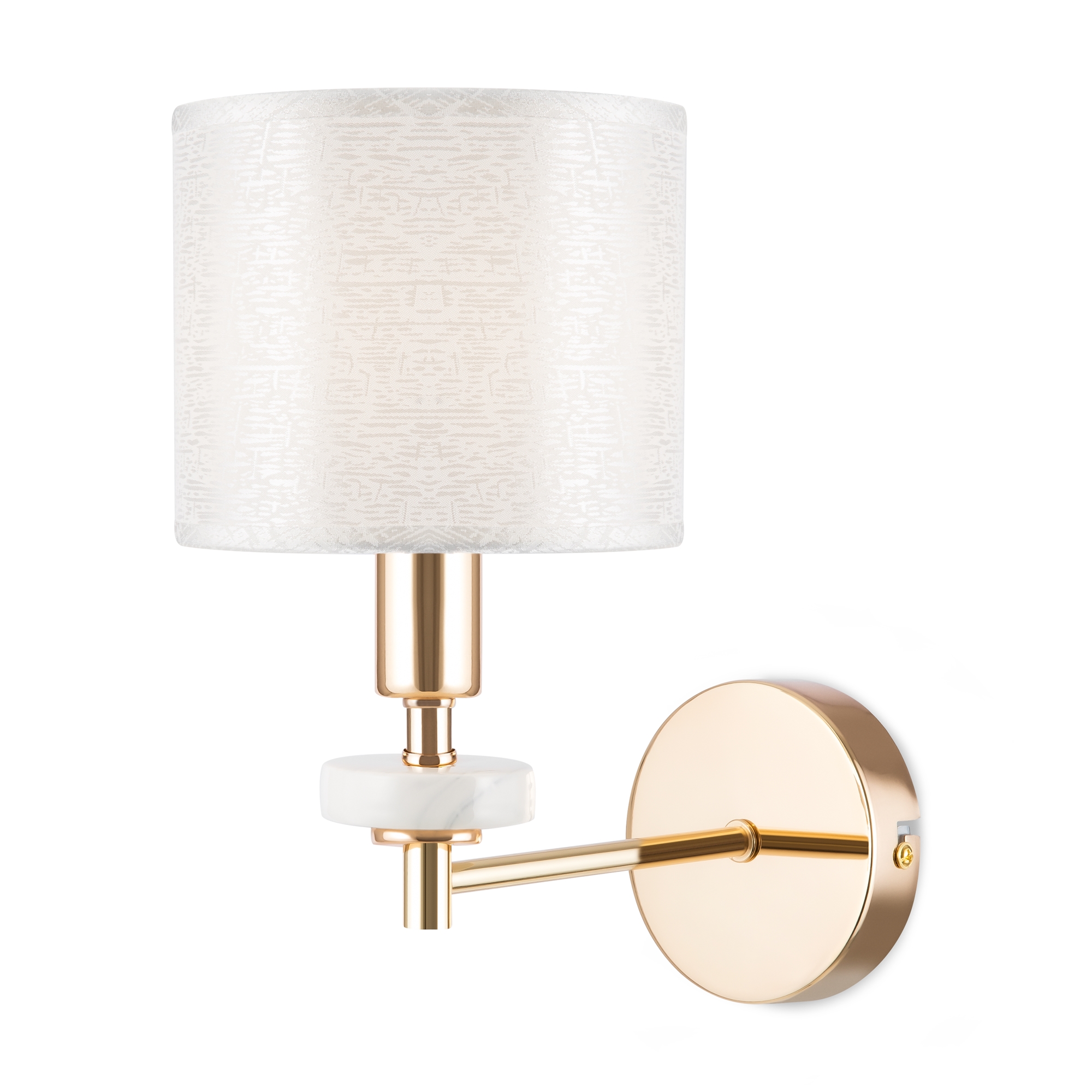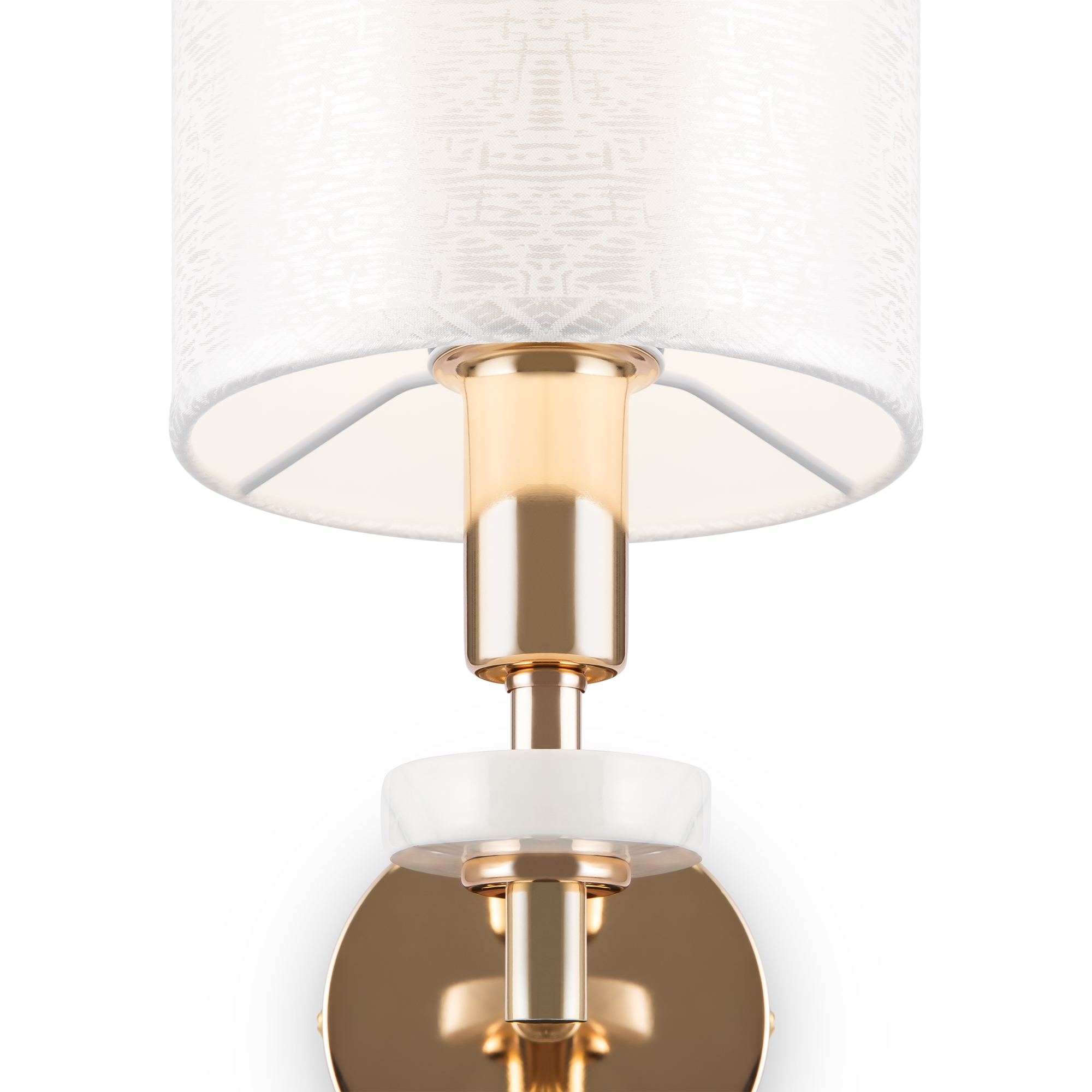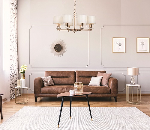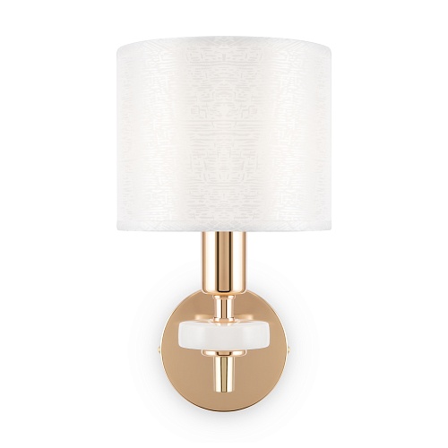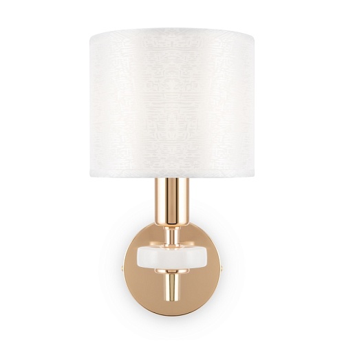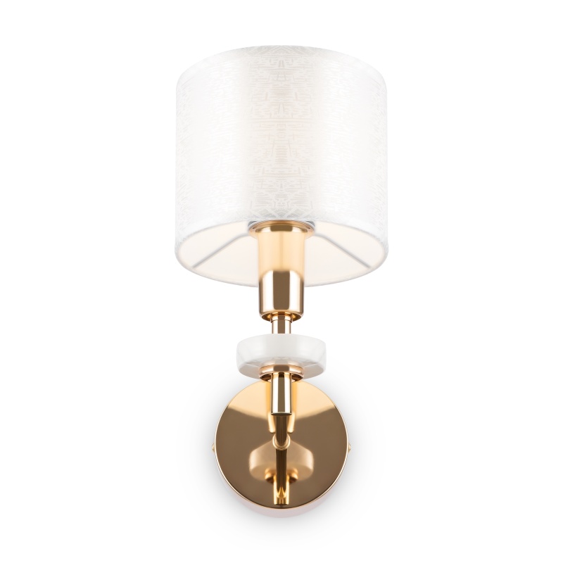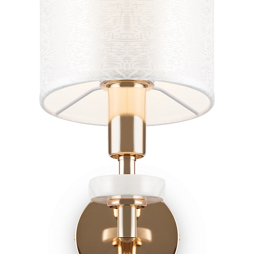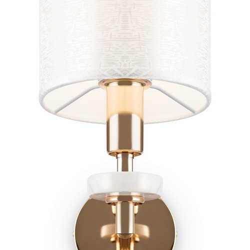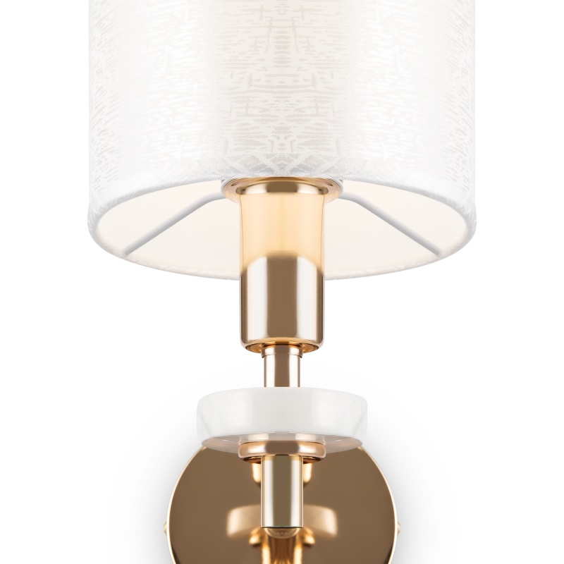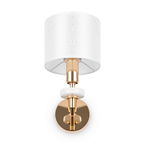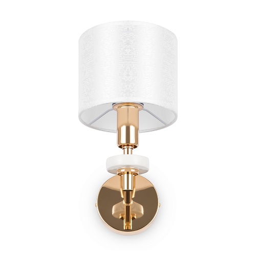 Металлическая арматура золотого оттенка. Абажуры – текстиль на ПВХ кремового цвета. Трендовый керамический декор с имитацией мрамора. Источник света – лампа с цоколем E14.