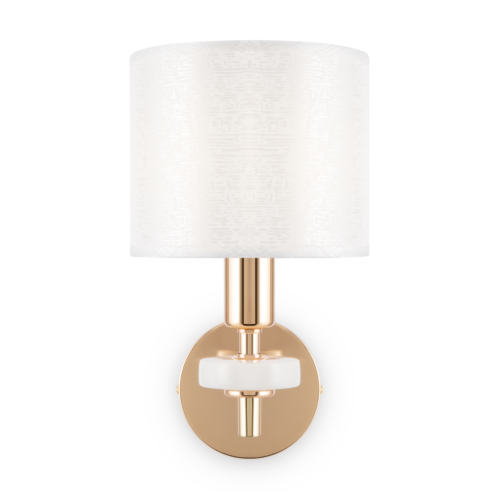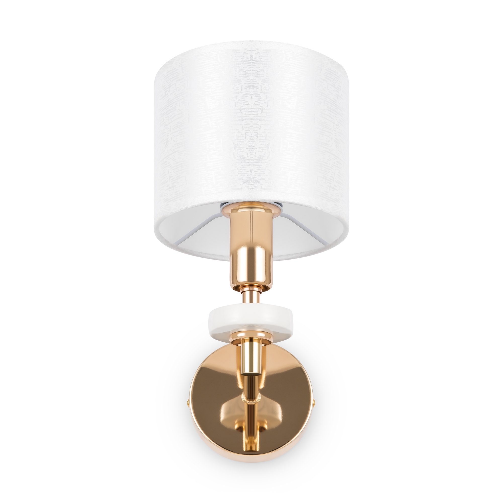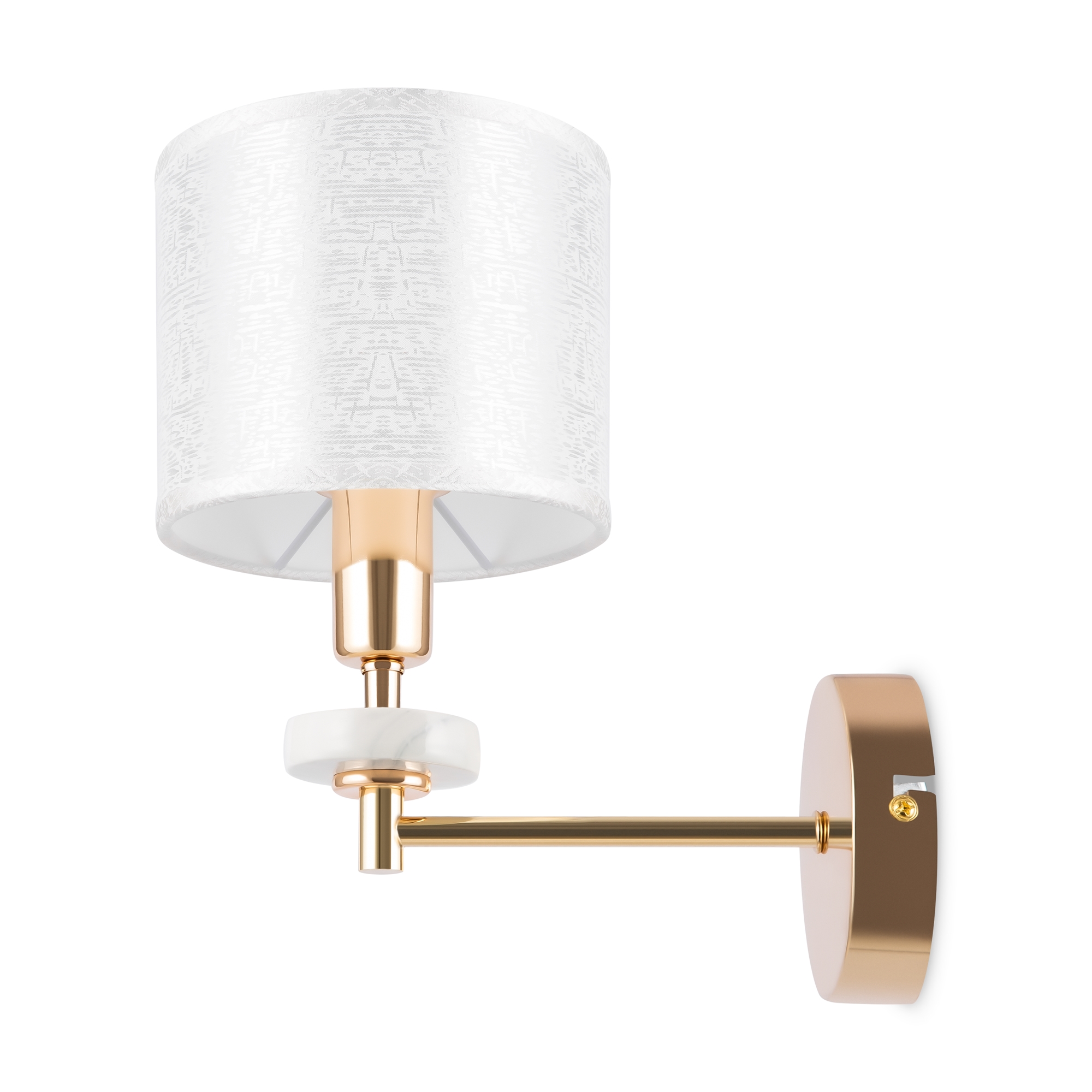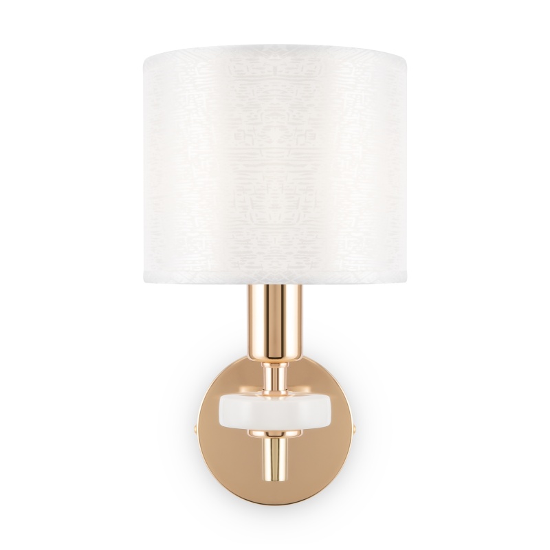 Металлическая арматура золотого оттенка. Абажуры – текстиль на ПВХ кремового цвета. Трендовый керамический декор с имитацией мрамора. Источник света – лампа с цоколем E14.
