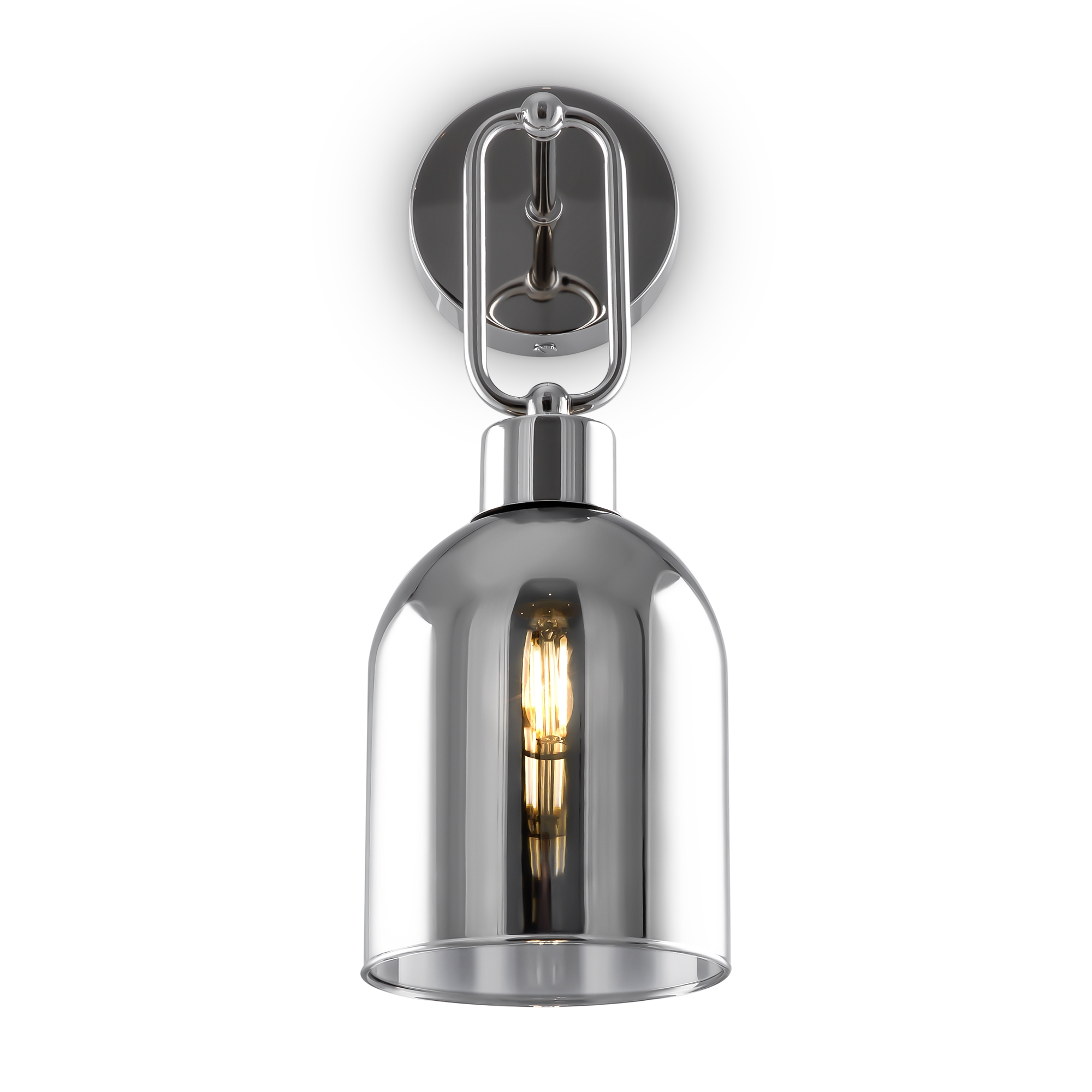 Хромированная металлическая арматура. Стеклянный плафон гальванизирован в тон арматуре. Трендовый арочный силуэт. В качестве источника света используется лампа с цоколем Е27.