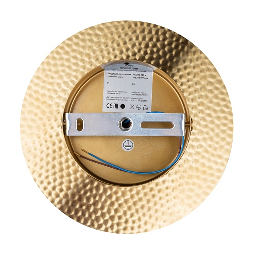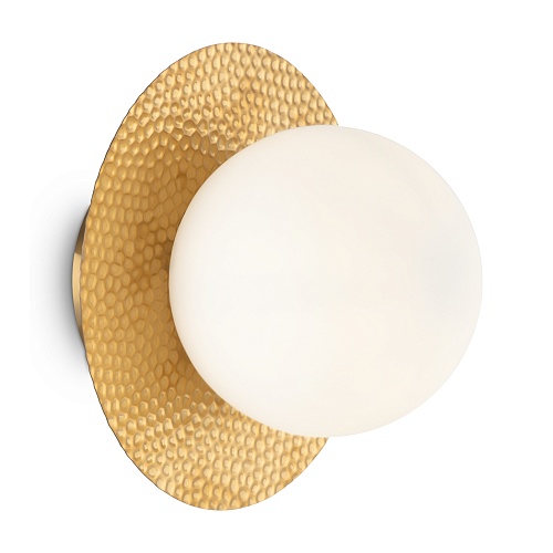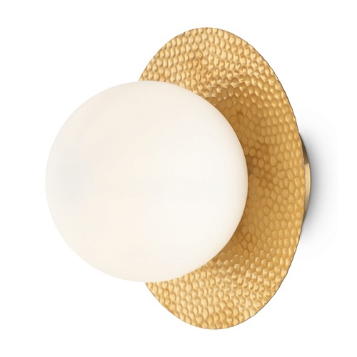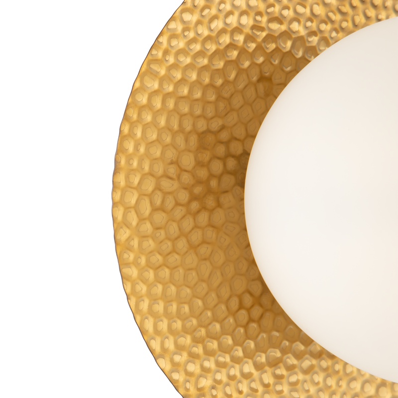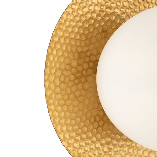 Арматура из металла, цвет – латунь. Плафоны сферической формы из матового белого стекла. Плоские розетки с эффектом чеканки. Трендовый микс фактур. Источник света – лампа с цоколем Е27.