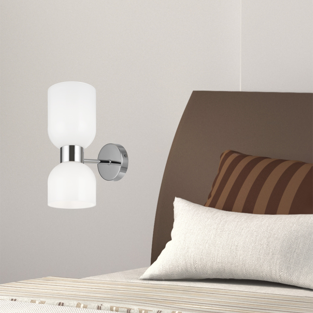 Арматура из металла. Оттенки – хром и латунь. Стеклянные плафоны в двух цветовых решениях: белый глянец и хром с зеркальным эффектом. Оригинальная форма плафонов «песочные часы», двунаправленный световой поток. Широкий ассортимент. Источник света – лампа с цоколем E27.