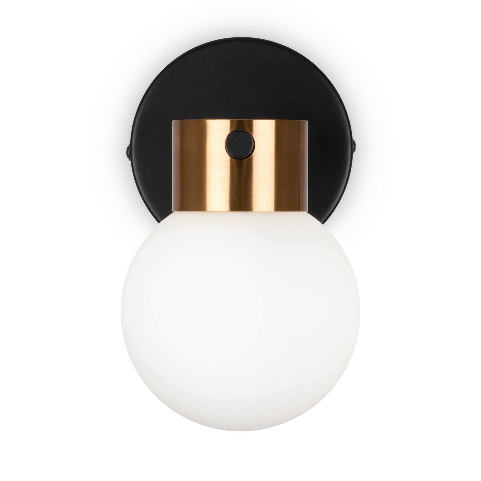 Металлическая арматура, цвет - черный + латунь. Стеклянные плафоны в двух оттенках - матовый белый или дымчатый. Направление плафонов в разные стороны позволяет распределить свет максимально равномерно. Источник светал - лампы с цоколем G9.