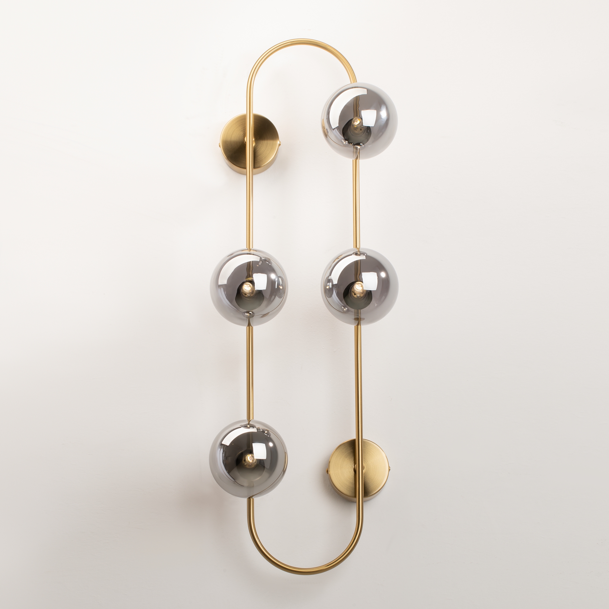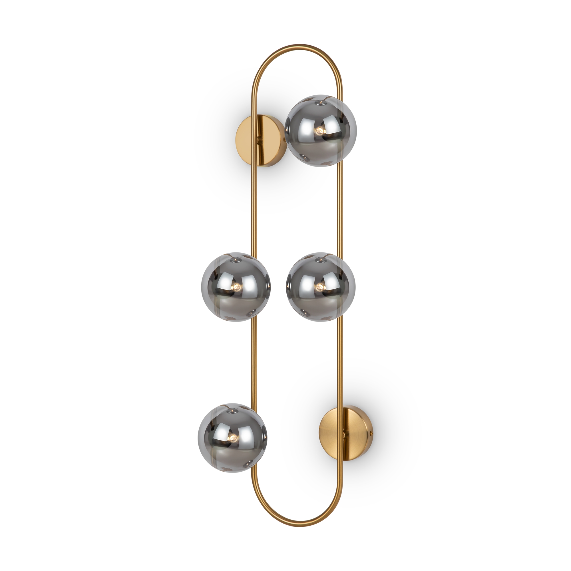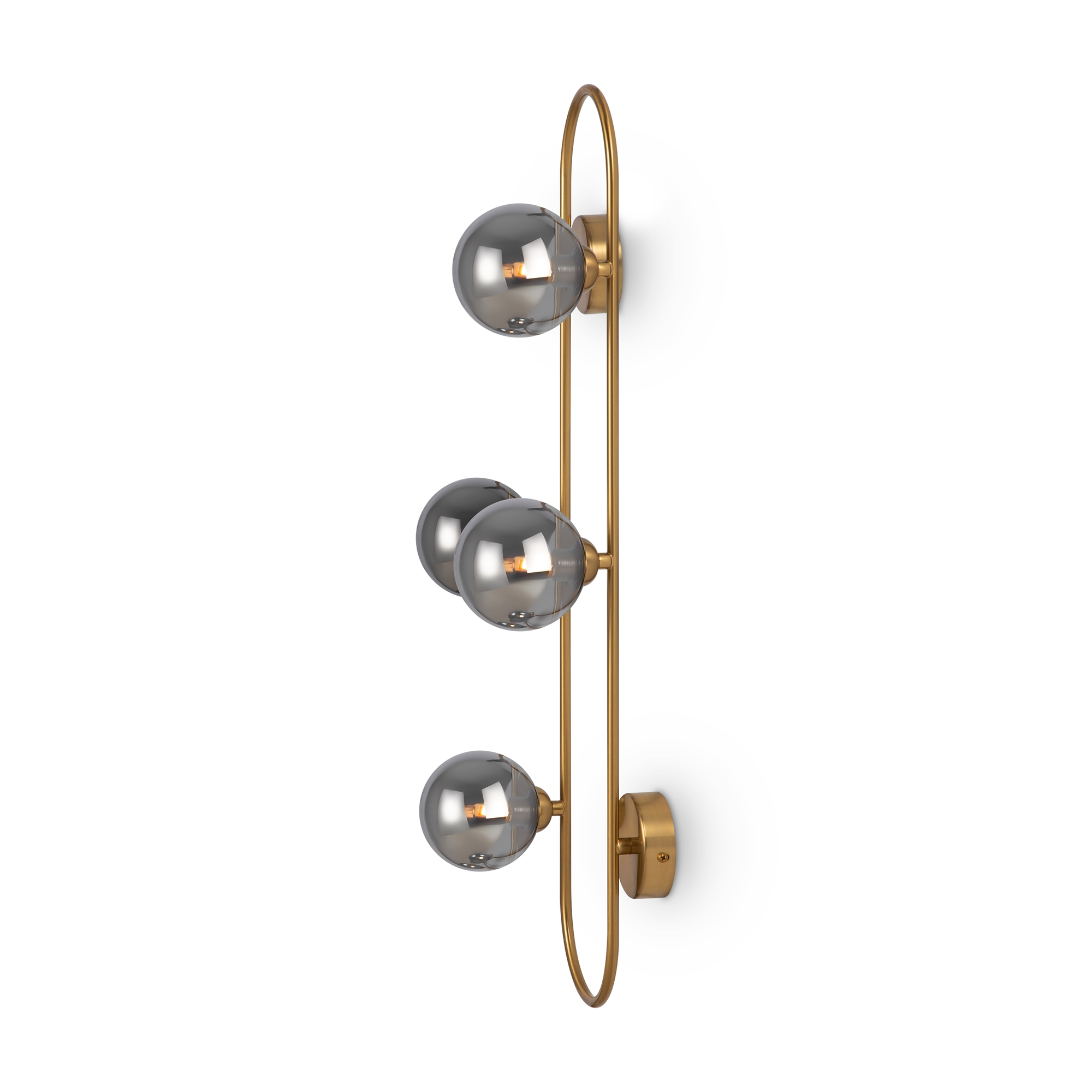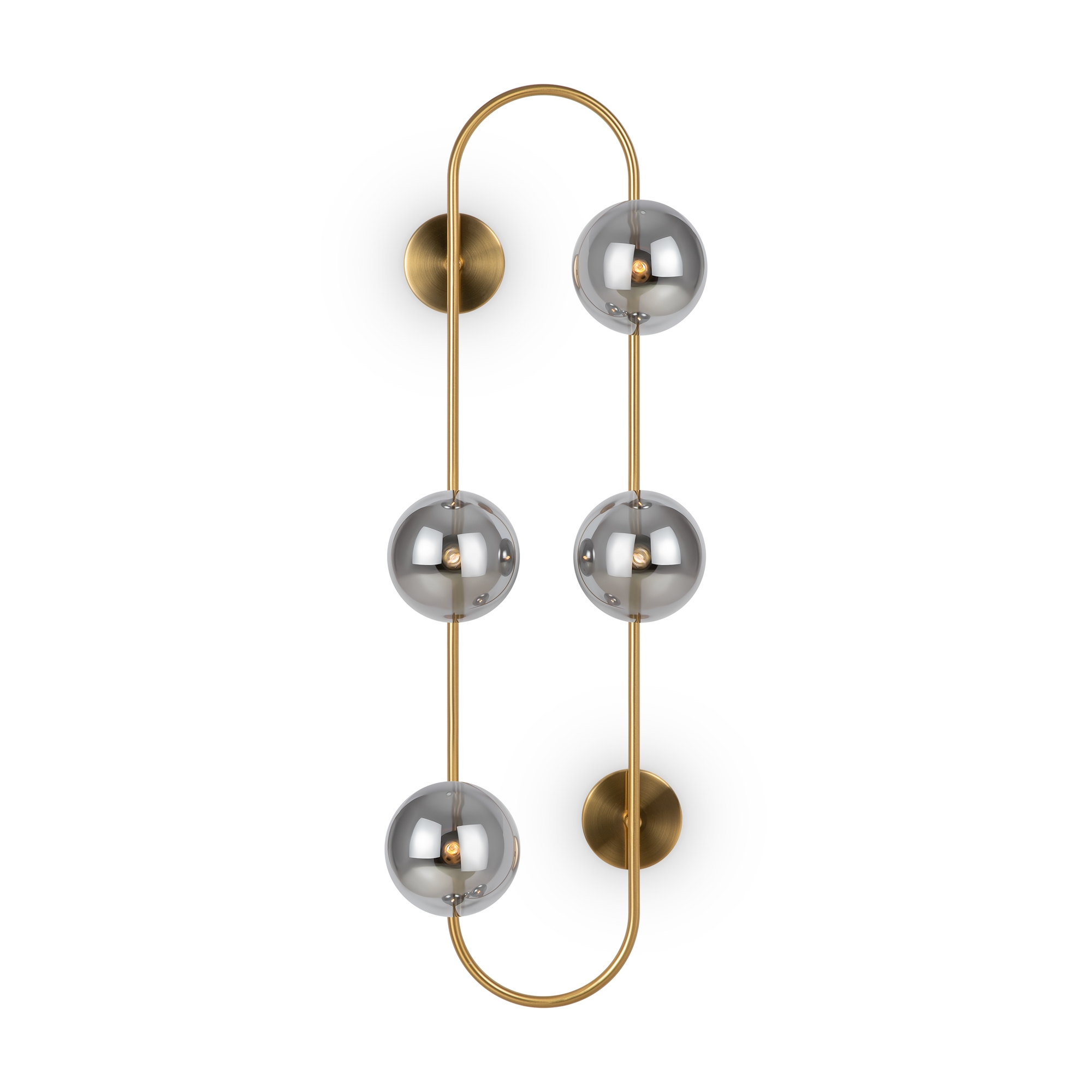 Арматура - металл, цвет - латунь. Стеклянные плафоны-сферы в двух оттенках белый матовый и дымчатый в настенно потолочной версии. Округлые и плавные линии - беспроигрышное сочетание для современных интерьеров. Настенные бра можно использовать как для общего на потолке так и для зонального настенного освещения Источник света - лампа с цоколем G9.