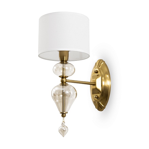 Арматура из металла, цвет — латунь. Плафоны — тканевые, молочного цвета. Металлическая конструкция декорирована выдувными стеклянными элементами с перламутровым напылением. Источником света служит лампа с цоколем Е14.