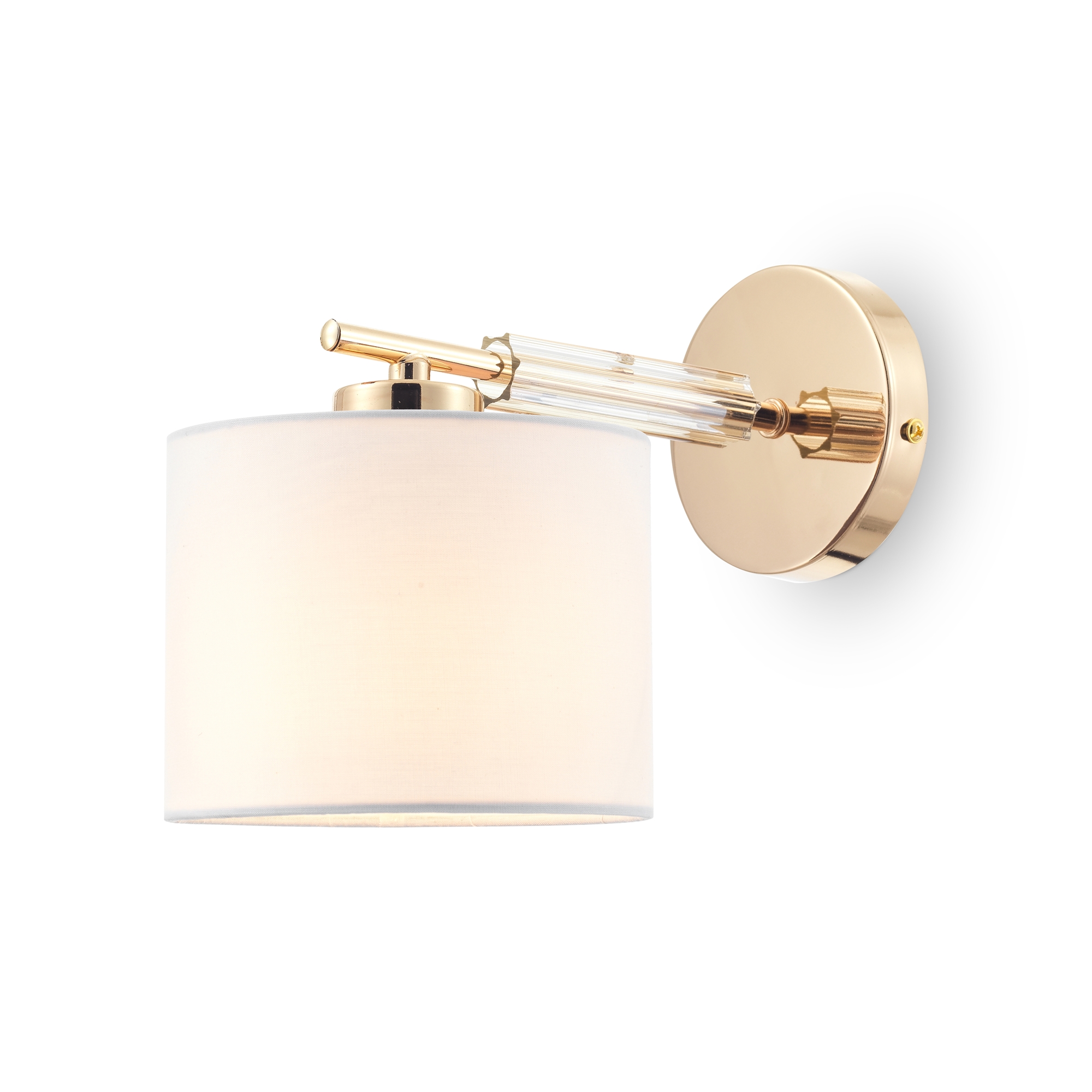 Арматура – металл + стекло, цвет - золото. Универсальные тканевые абажуры в белом цвете. Декоративные элементы из прозрачного рельефного стекла. Источник света - лампа с цоколем Е27.