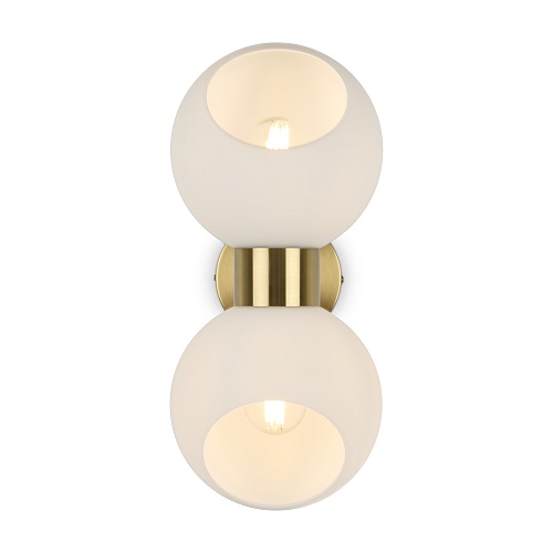 Металлическая арматура в цвете латунь. Открытые сферические плафоны в 2-х цветах: тёплый белый и тёмный гальванизированный. Плафоны разделены металлической вставкой в цвет арматуры. Источником света является лампа с цоколем G9. Для бра - цоколь Е27.