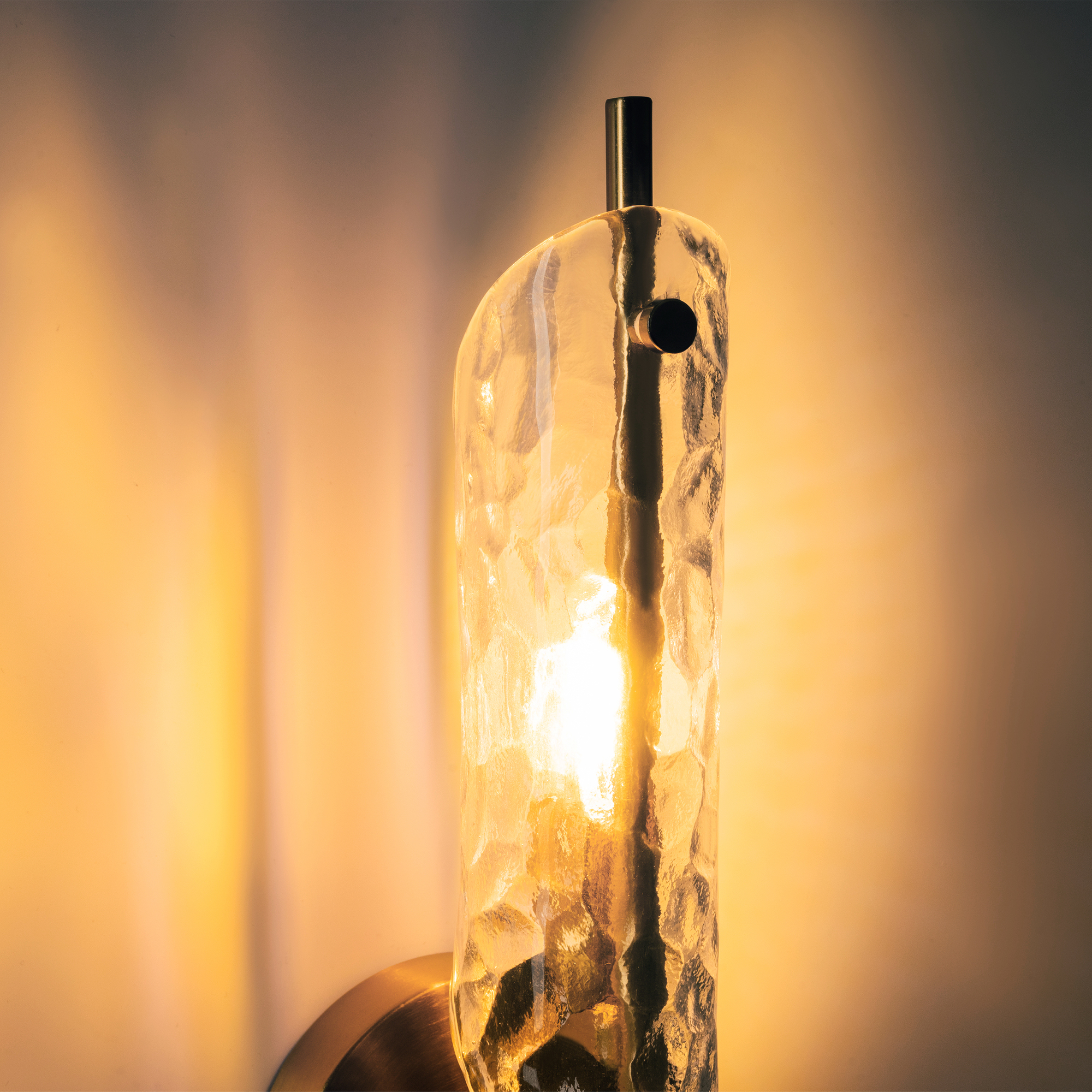 Металлический корпус, цвет— латунь. Плафон, моделированный под вытянутый лепесток с эффектом чеканки на стекле. Источник света — лампа с цоколем G9 и максимальной мощностью 30W дает яркое и равномерное освещение. Компактная высота – идеальное решение для низких потолков.