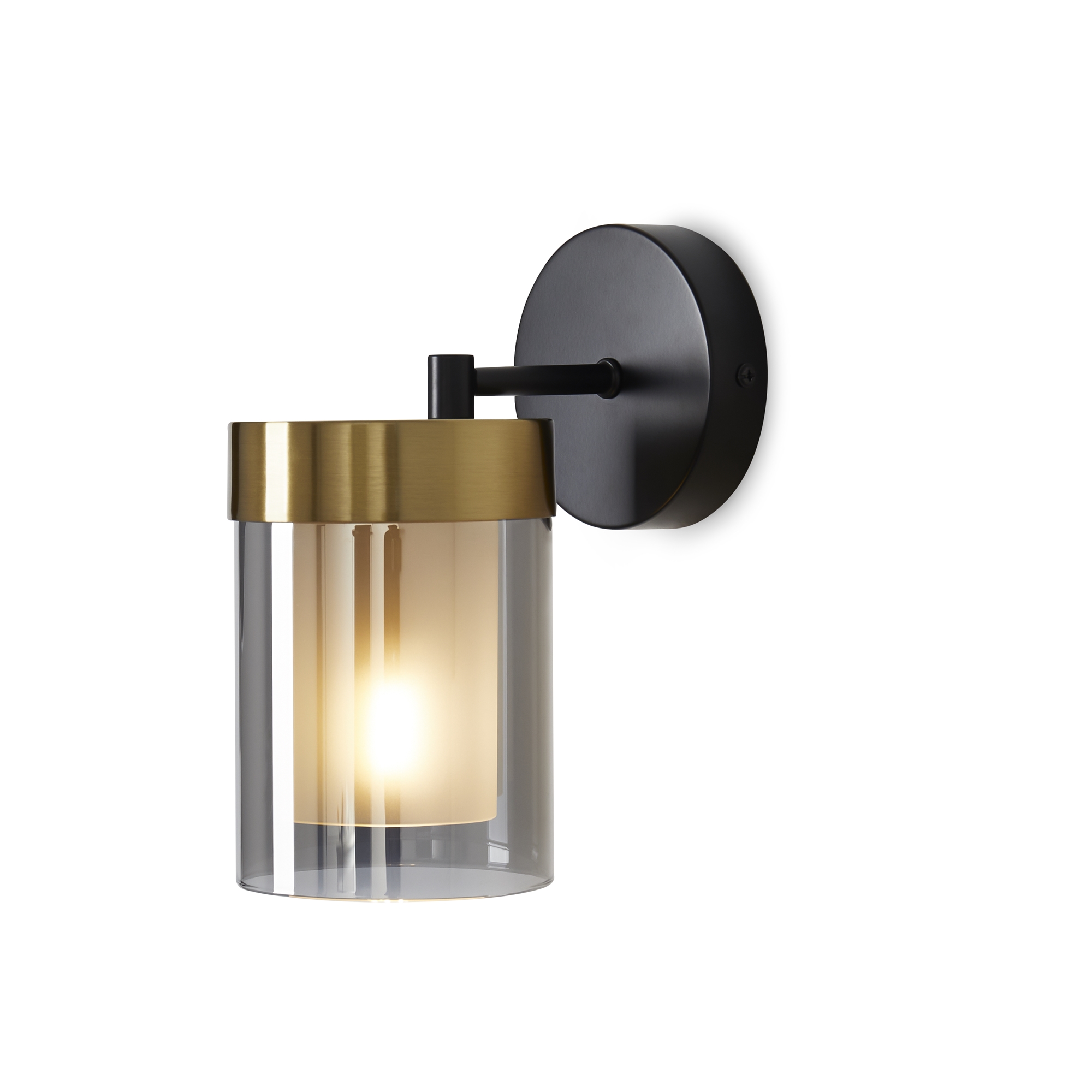 Арматура - металл в двух востребованных оттенках латунь и черный. Плафоны из двойного стекла дымчатого оттенка, внутри белый матовый. Трендовая форма плафонов в виде цилиндра. Потолочные светильники подойдут для помещений с низкими потолками. Источник света лампа. Цоколь E14