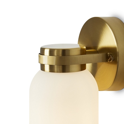 Арматура из металла. Цвет латунь. Плафоны из белого стекла новой необычной формы. Два варианта светильников — потолочные и бра. Подходит для помещений с низкими потолками. Источник света — лампа. Цоколь E14.
