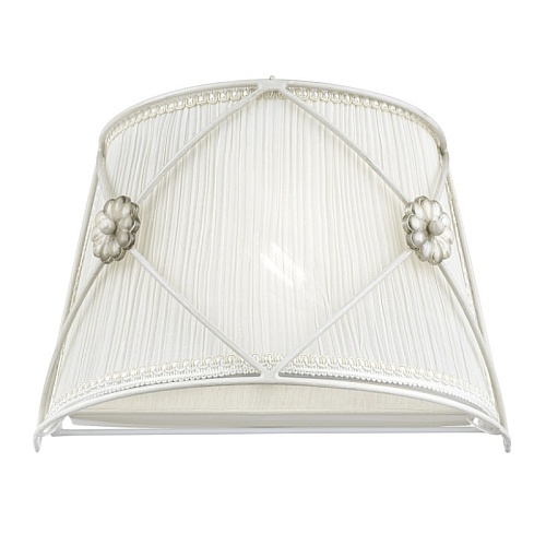 Арматура из металла в жемчужно-белом цвете. Кремовый абажур из плиссиро ванной органзы, окантовка золотистой тесьмой. Абажур заключен в металличе ский каркас. Флористический декор.
