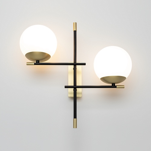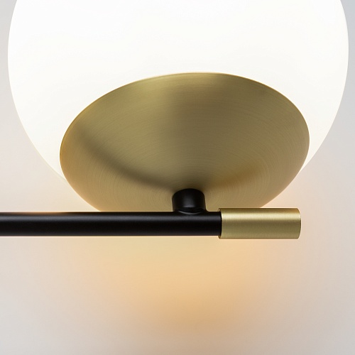 Арматура из металла в цвете матового золота. Плафоны-сферы из матового выдувного стекла. Модная асимметрия в дизайне. Источник света — лампы с цоколем Е14.