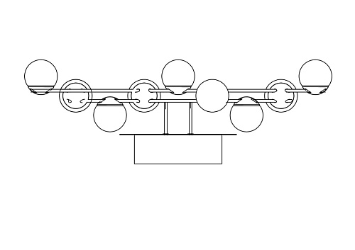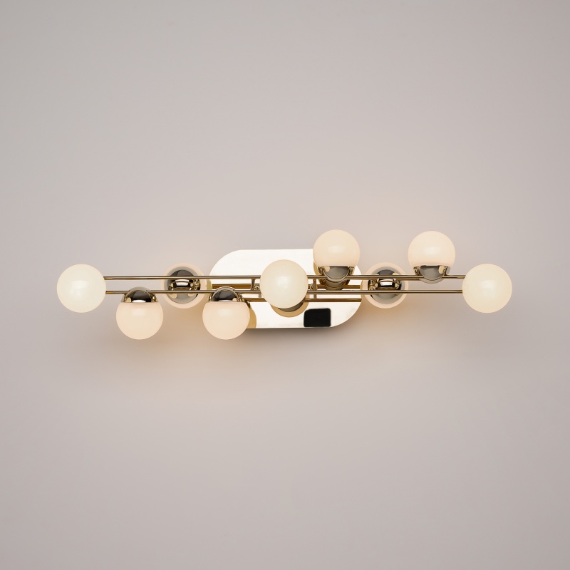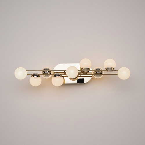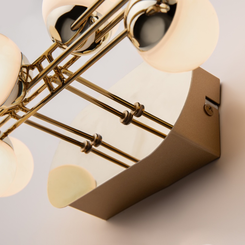 Арматура из металла в золотом цвете. Плафоны-сферы — белый пластик. Дизайн с имитацией молекулярной структуры. LED-источники света.