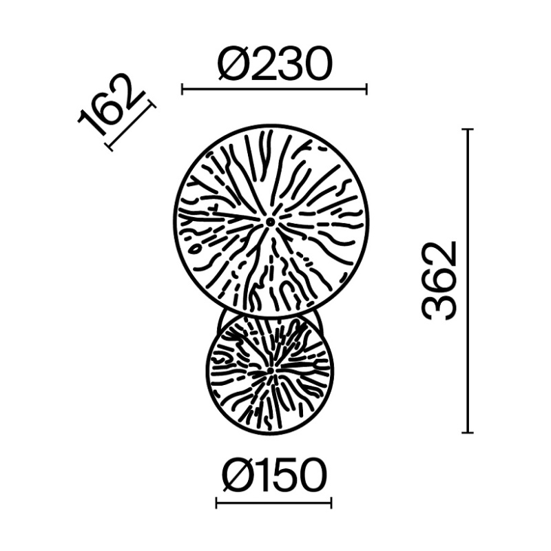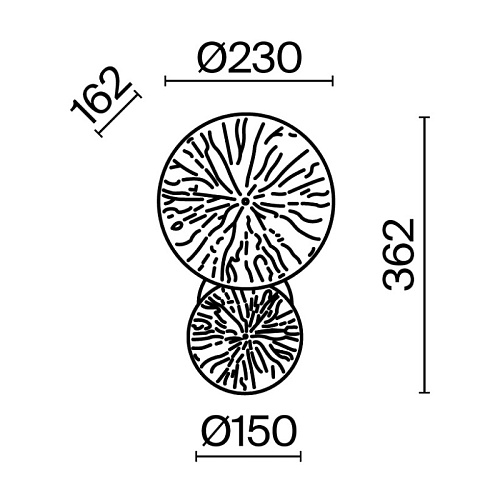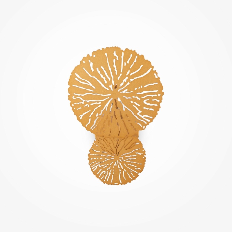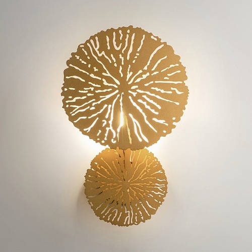 Арматура из металла, цвет — матовая латунь. Декор — ажурные диски в тон арматуре. Эффектный световой рисунок. Трендовые флористические мотивы в дизайне. Светильники серии легко комбинировать, создавая композиции. Источник света – лампа с цоколем Е14.