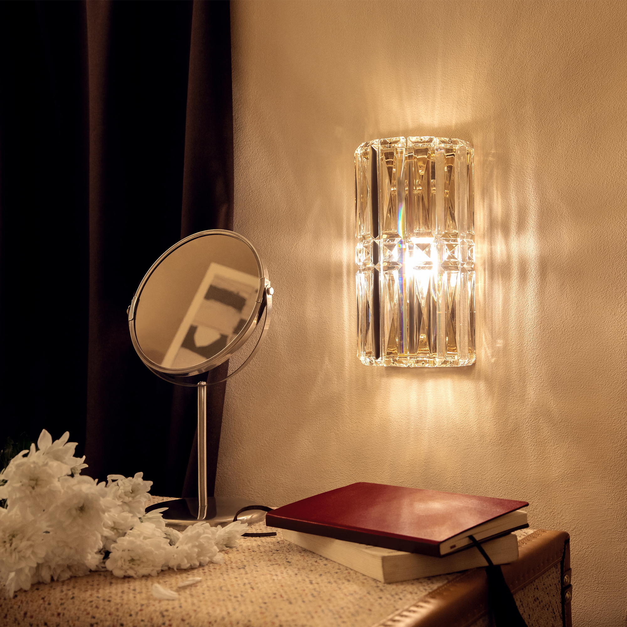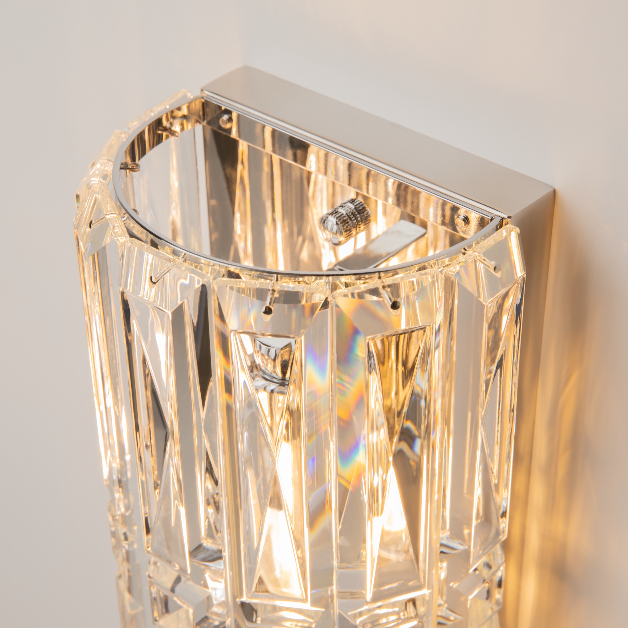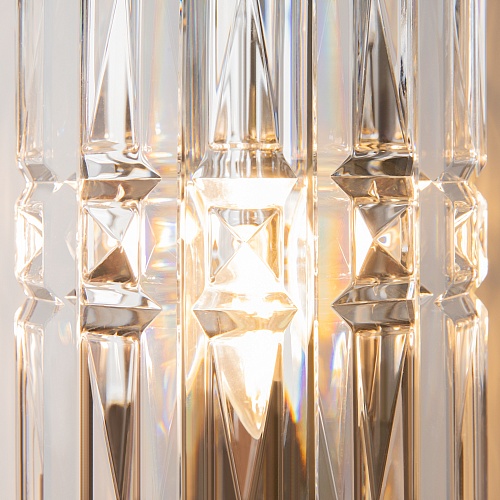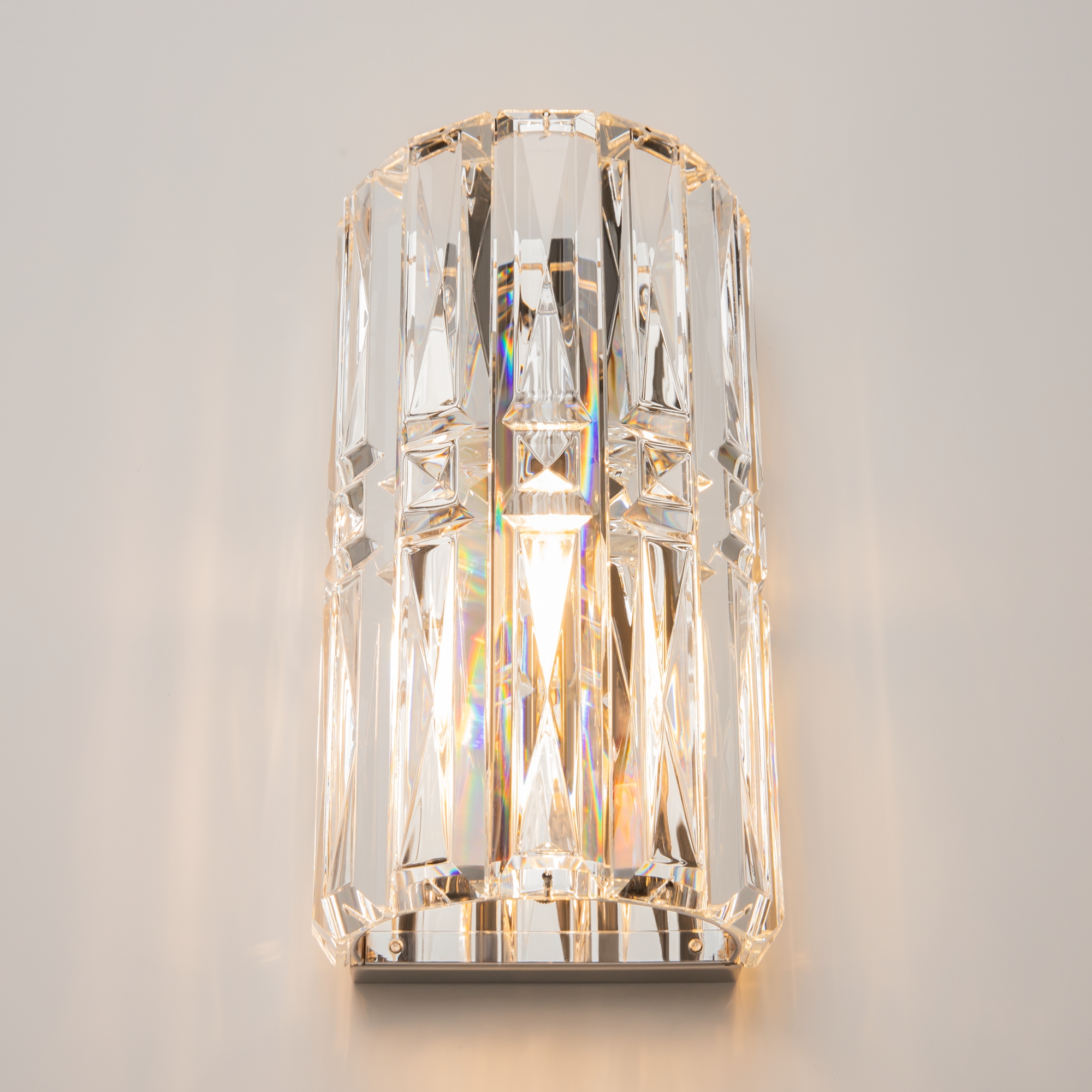 Материал арматуры – металл, оттенки – хром и золото. Декор – прозрачные стек лянные кристаллы. Архитектурная огранка декоративных элементов. Цоколь Е14.